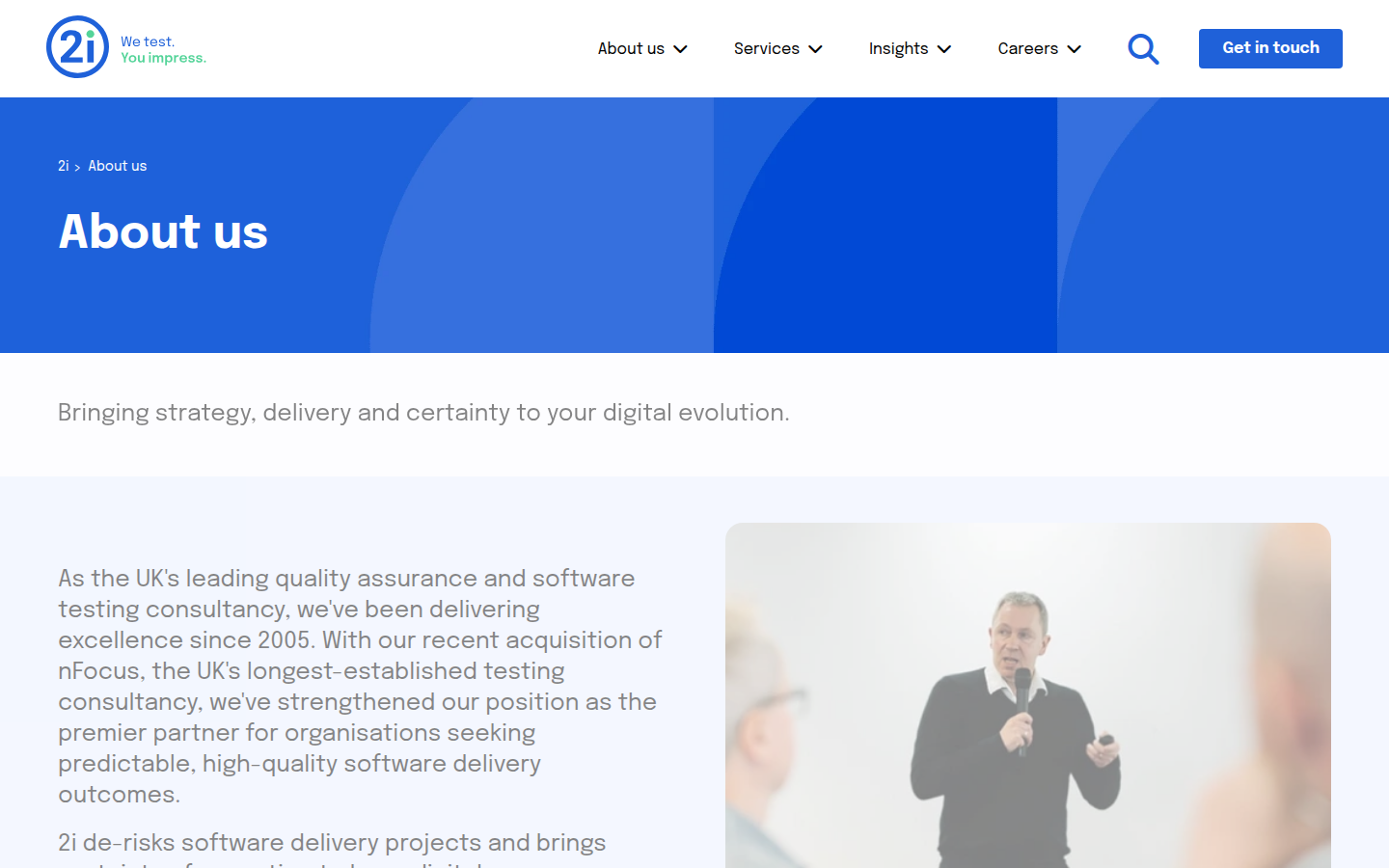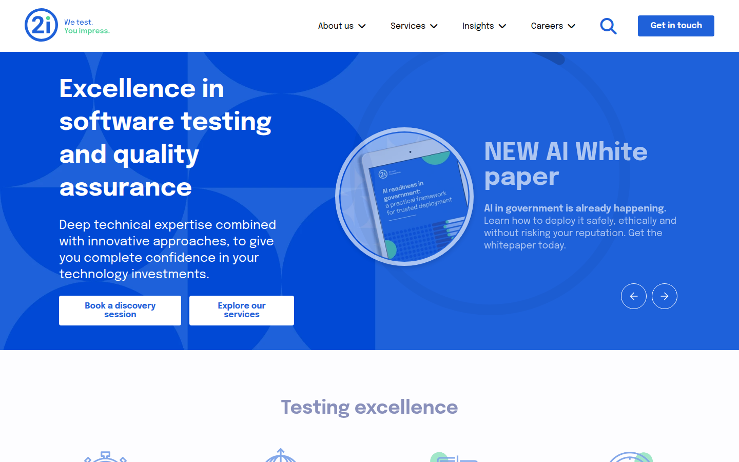 2i Testing is a software testing and quality assurance company that specializes in serving highly regulated industries where software quality, security, and reliability are mission-critical. The company offers comprehensive testing services including AI consultancy, test automation, synthetic data generation, ERP testing, and non-functional testing.