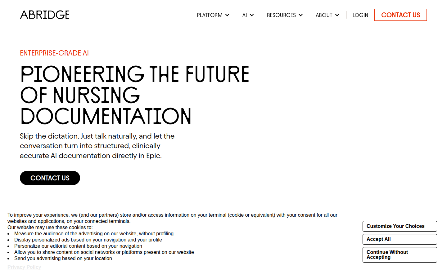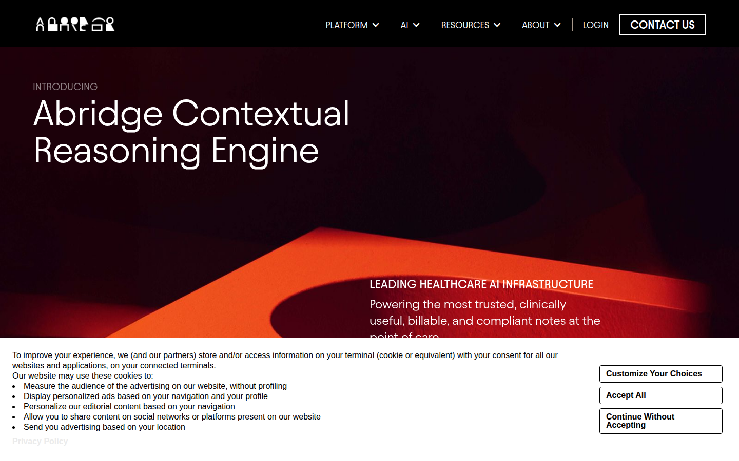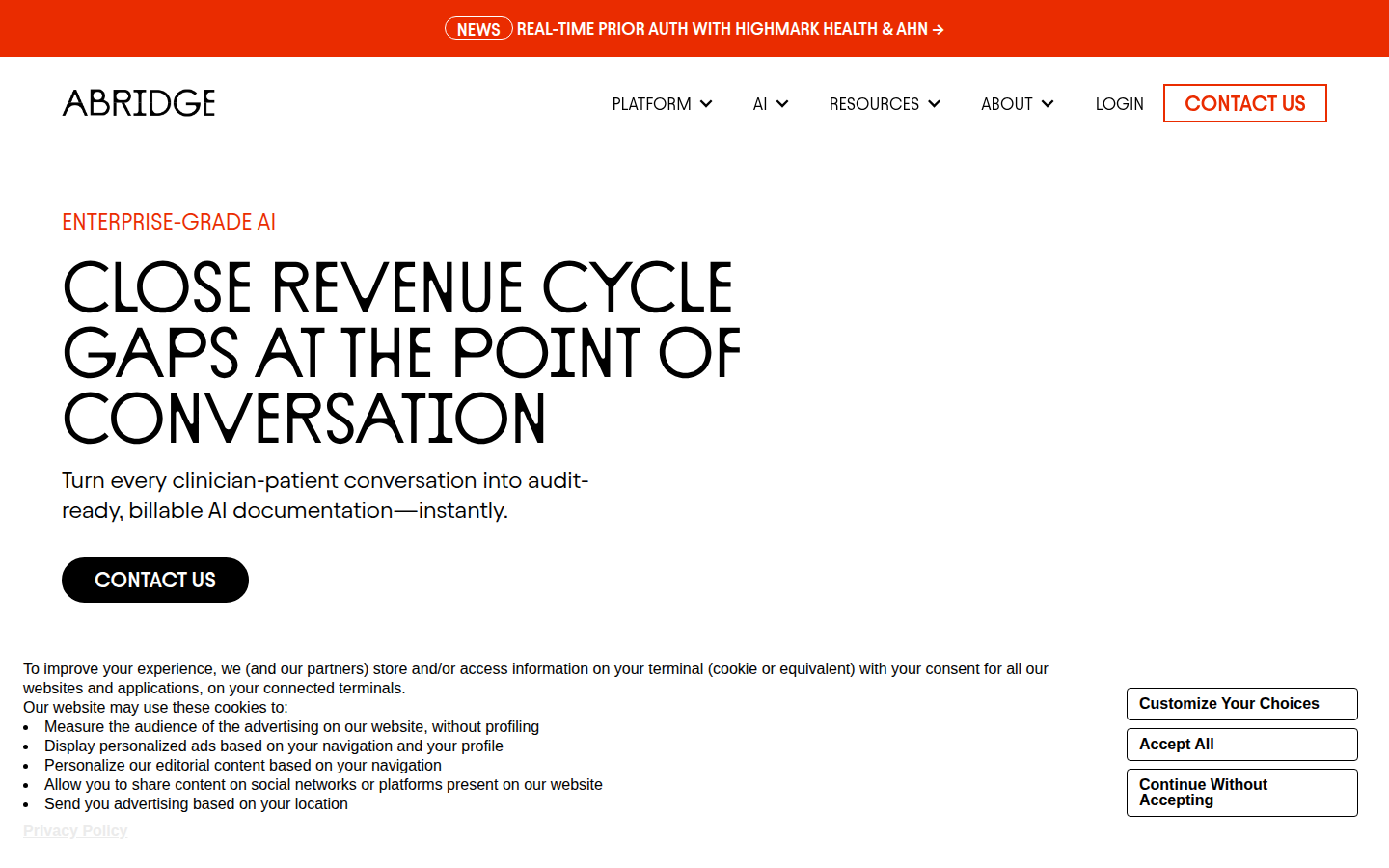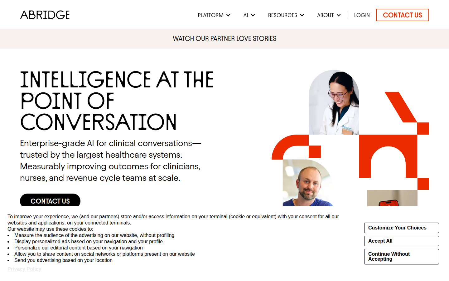 Abridge provides generative AI solutions specifically designed for clinical conversations in healthcare settings. The company's platform transforms patient-clinician conversations into contextually aware, clinically useful, and billable AI-generated notes in real time. Their technology is trusted by major healthcare systems including Johns Hopkins, Kaiser Permanente, Duke Health, and Mayo Clinic.
