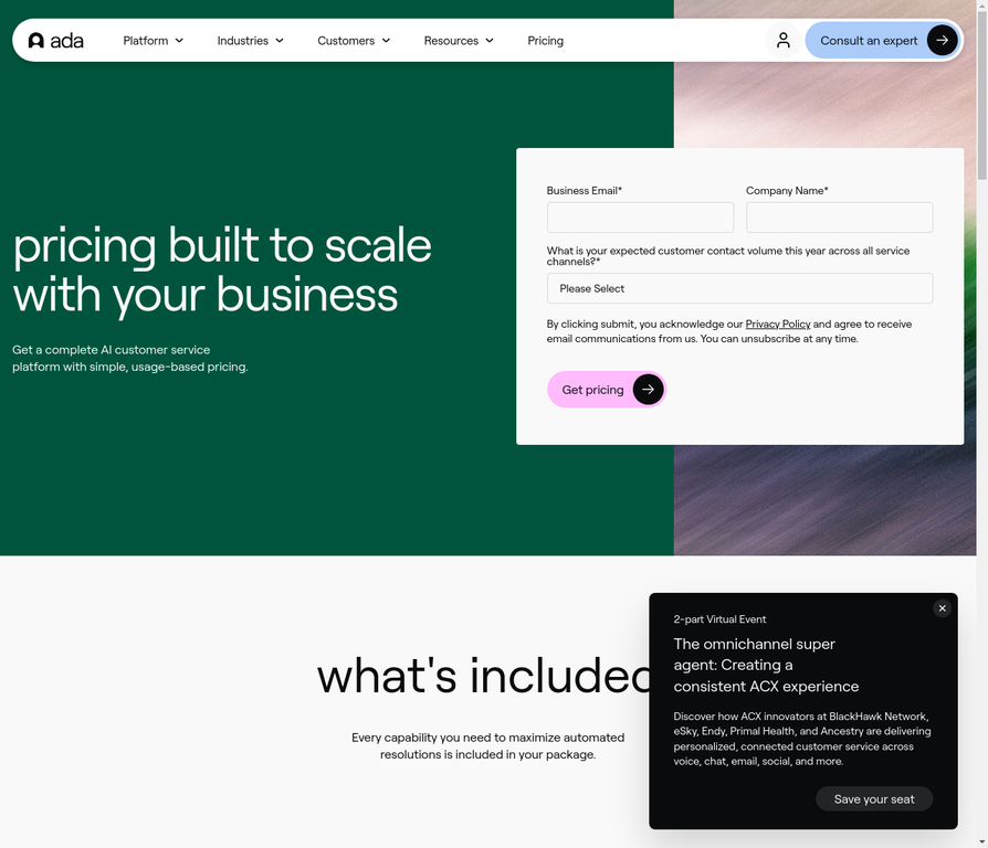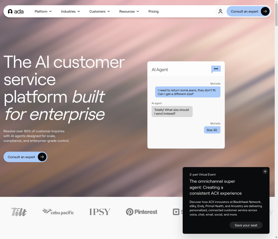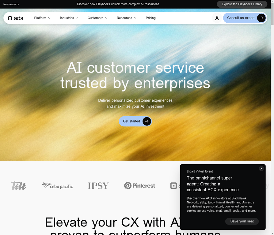 Ada is an enterprise AI customer service platform with omnichannel support across chat, voice, email, and social channels. It features a proprietary Reasoning Engine and Playbooks for complex workflows, delivering up to 84% automated resolution rates for customer inquiries.