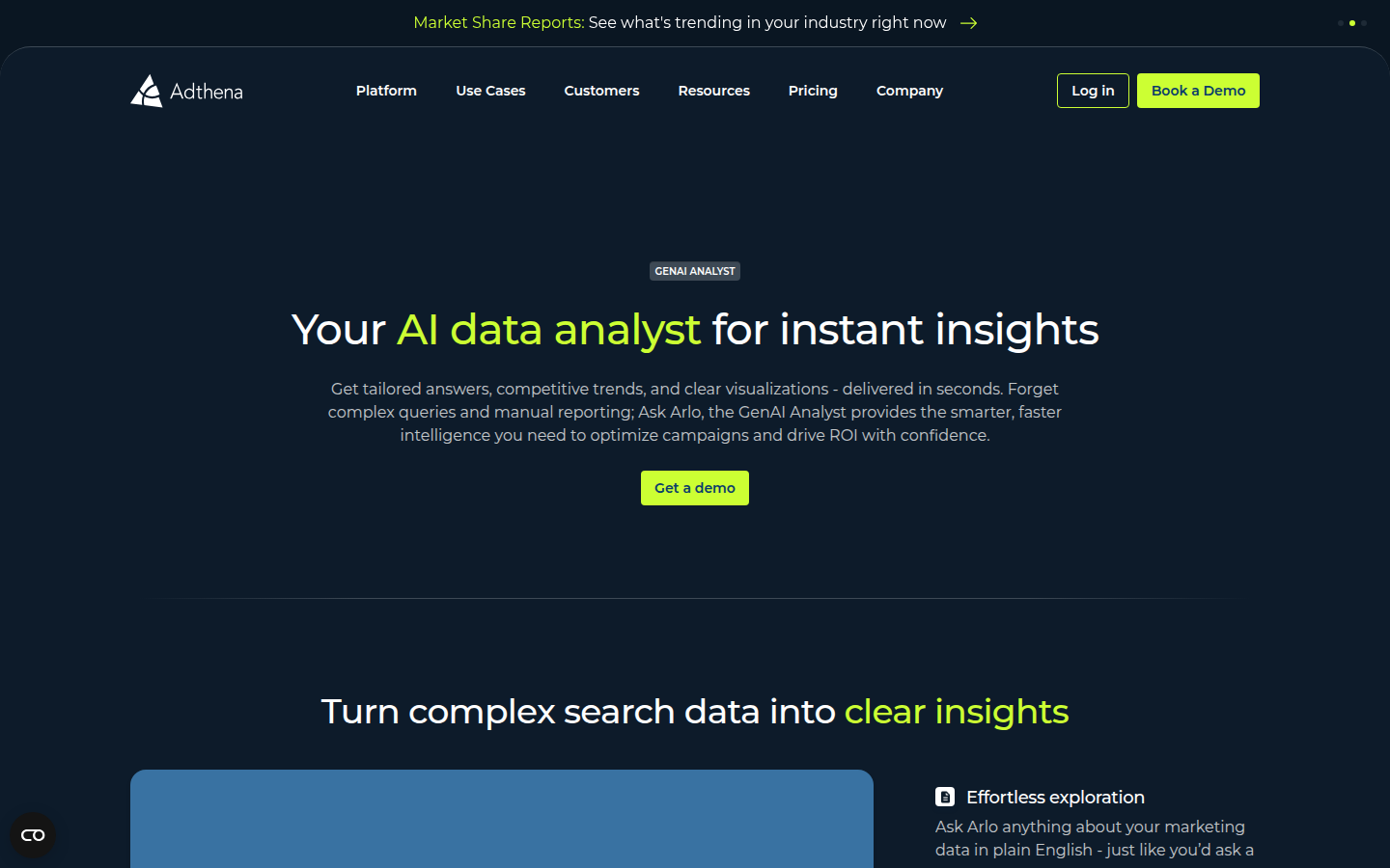 The platform features Ask Arlo, an award-winning GenAI analyst that provides conversational AI interface for intuitive data analysis. Adthena's solutions include tracking AI Overview impact, capturing LLM mentions in ChatGPT and Perplexity, blocking trademark infringements, eliminating brand overspend, and providing comprehensive market analysis. The company serves enterprise brands and digital agencies, helping them make faster, data-driven decisions while competitors are still manually analyzing data.