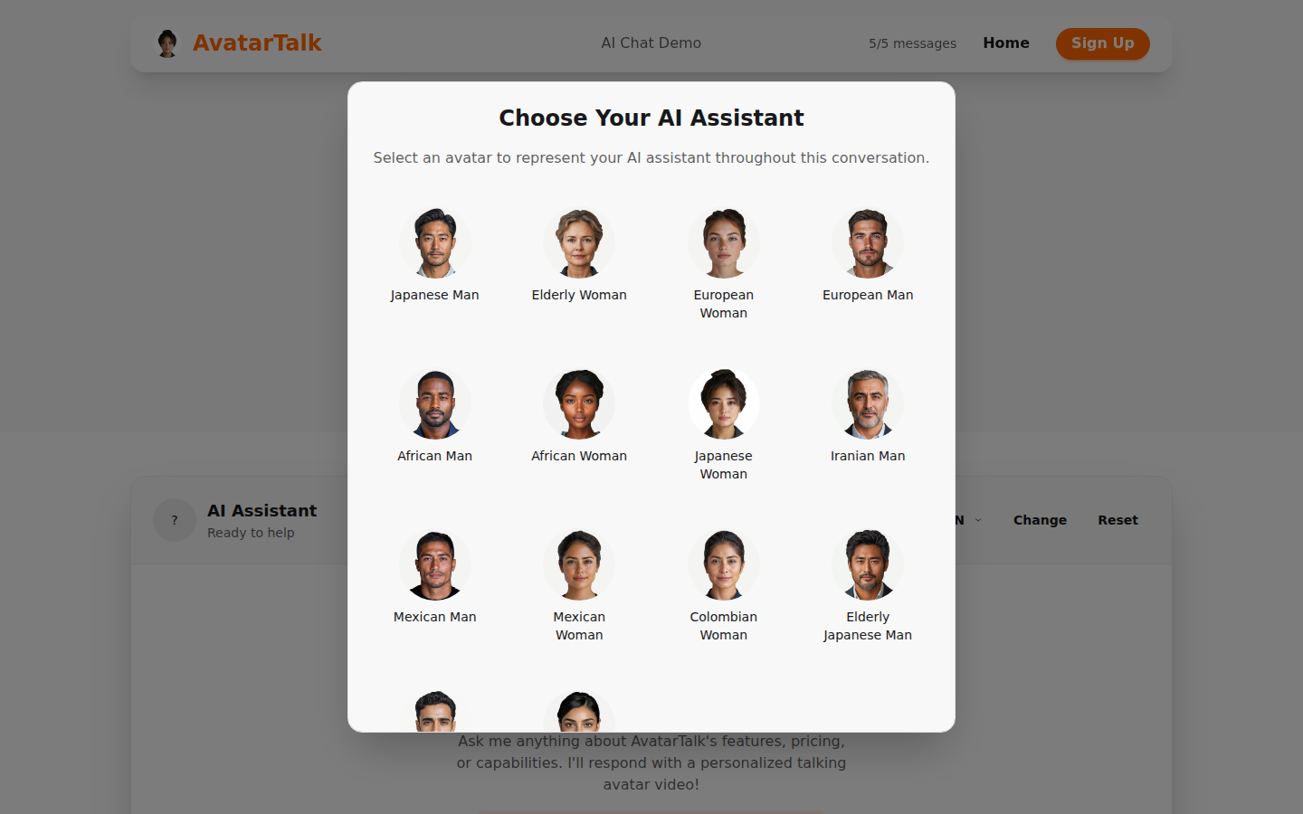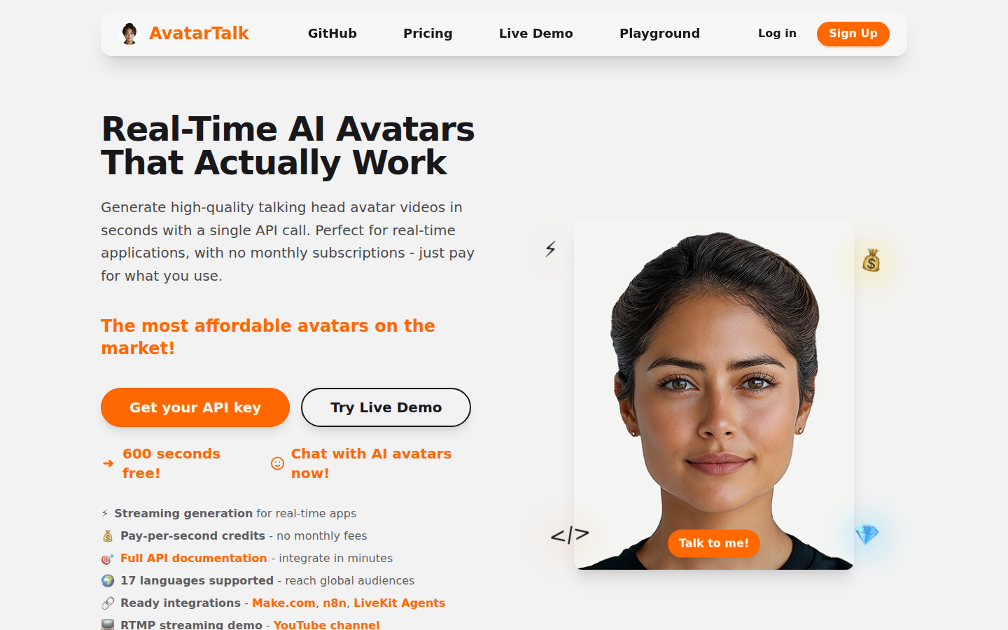 AvatarTalk is an AI avatar generation platform that enables businesses to create personalized, multilingual video content through a simple API. The platform allows users to generate talking head avatars with customizable emotions and languages, supporting a wide range of use cases from customer support to marketing and product onboarding. Their solution provides real-time video generation, supporting 17 languages and offering flexible, usage-based pricing without monthly subscriptions.