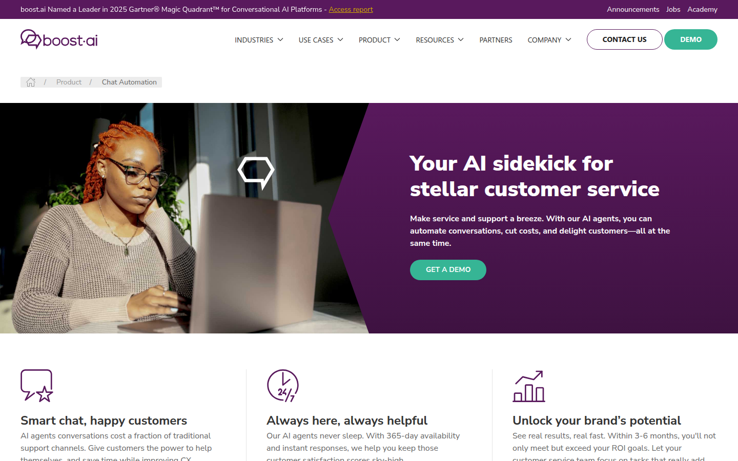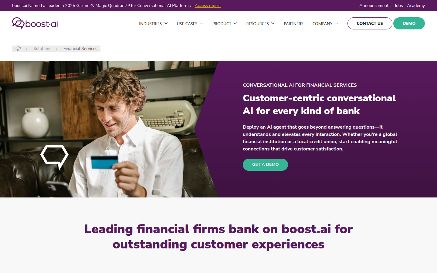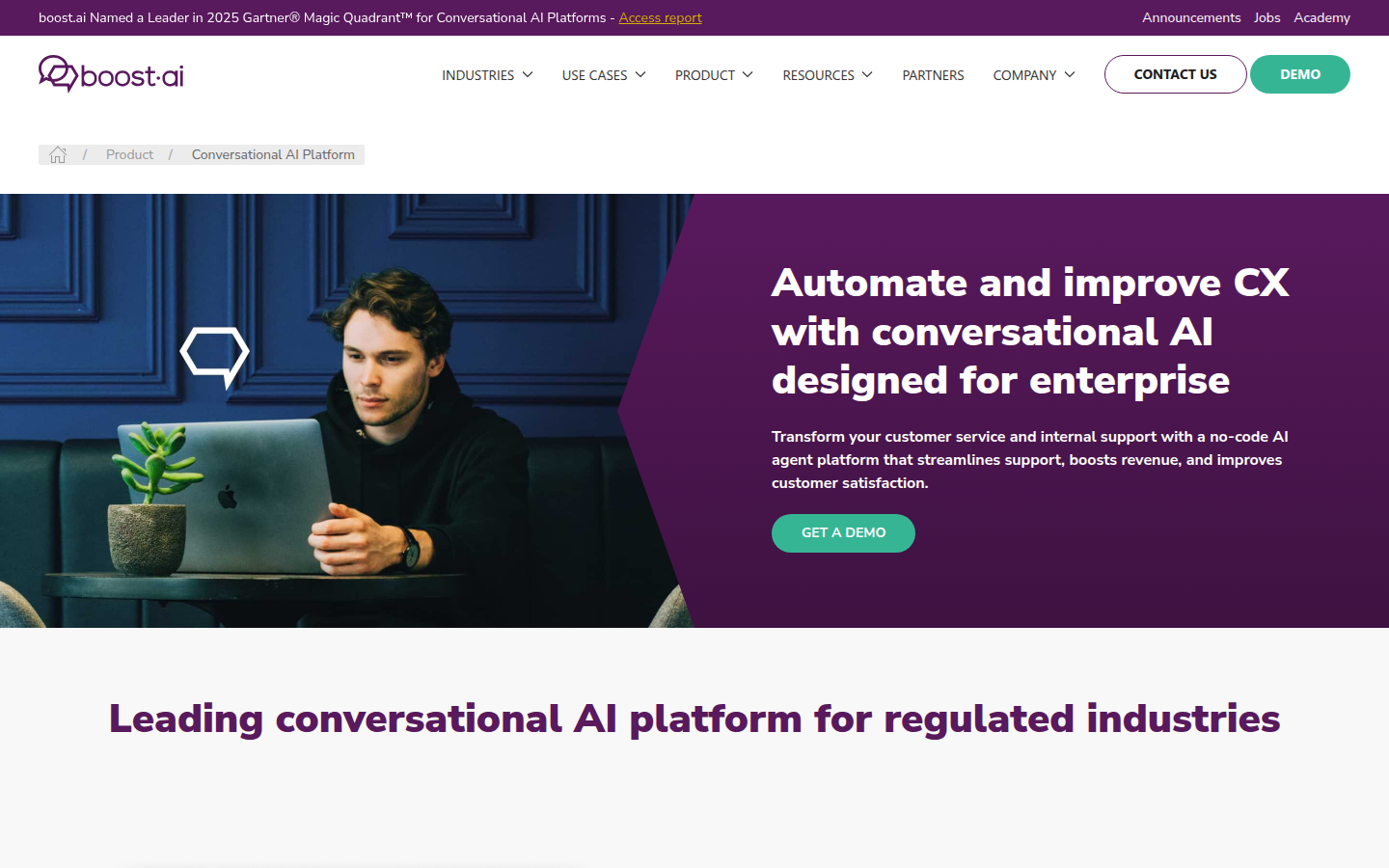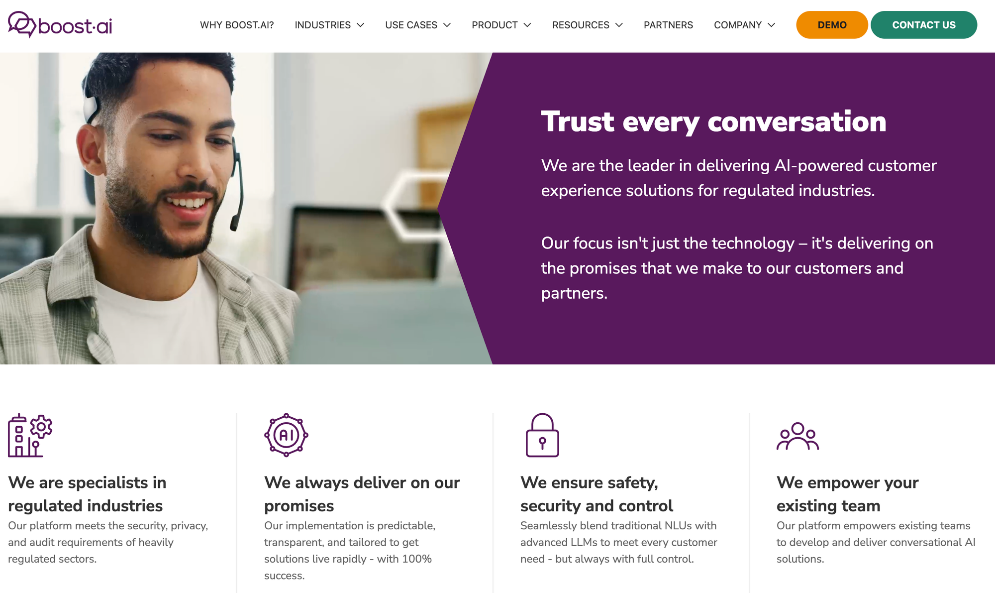 boost.ai is a conversational AI platform company that specializes in serving regulated industries with enterprise-grade solutions. Named a Leader in the 2025 Gartner Magic Quadrant for Conversational AI Platforms, the company provides advanced agentic conversational AI capabilities deployed with full governance and operational control.
