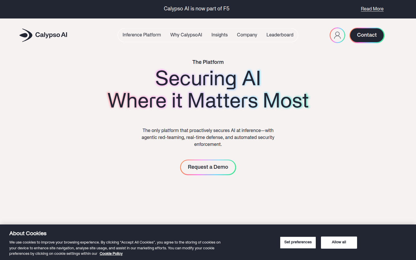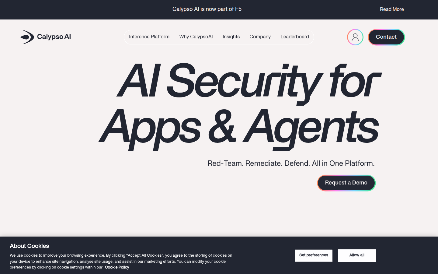 CalypsoAI is an AI security company that provides comprehensive protection for generative AI systems and applications. The company has been acquired by F5 and offers a unified platform that combines red-teaming, real-time defense, and observability capabilities for AI applications and agents.