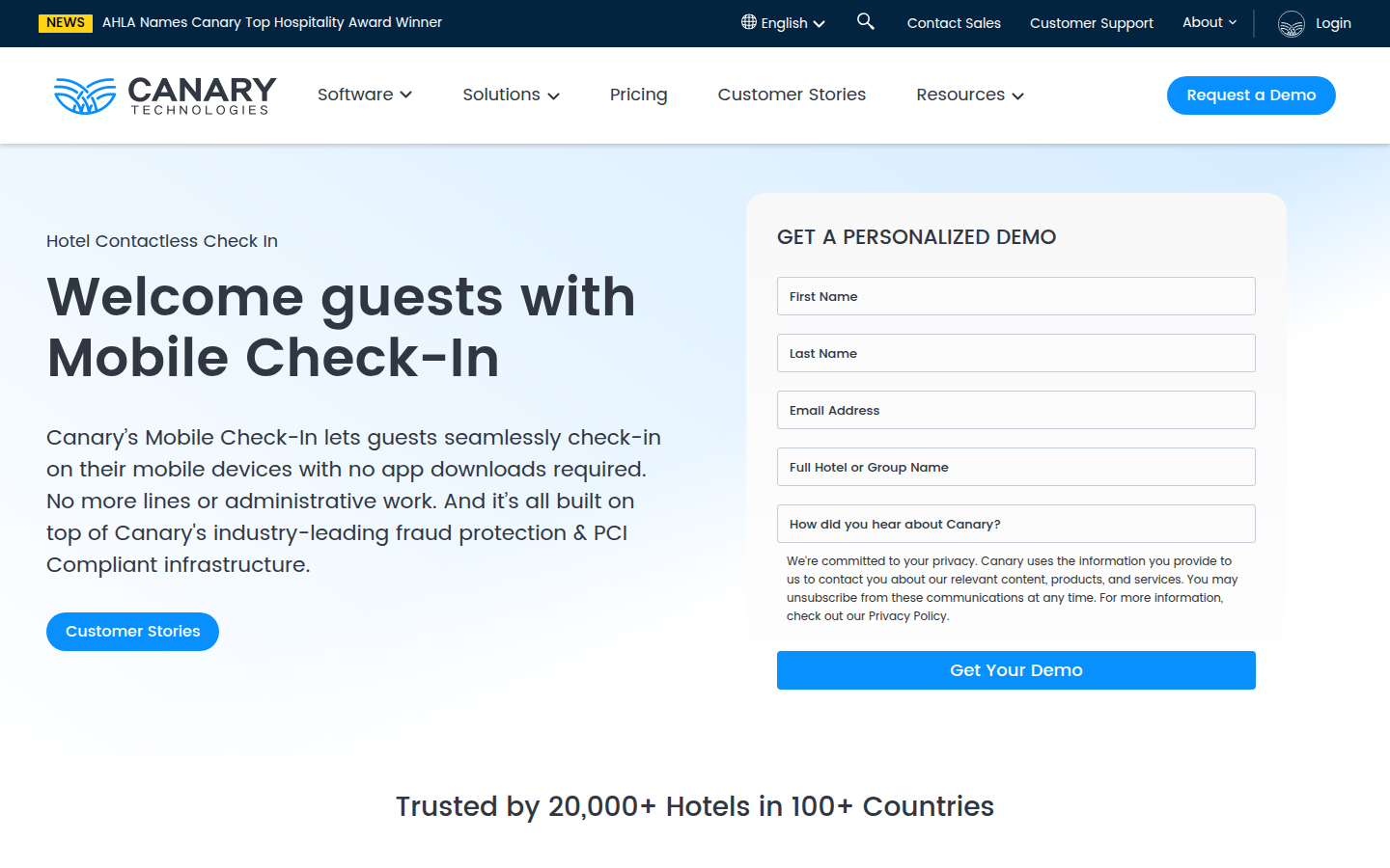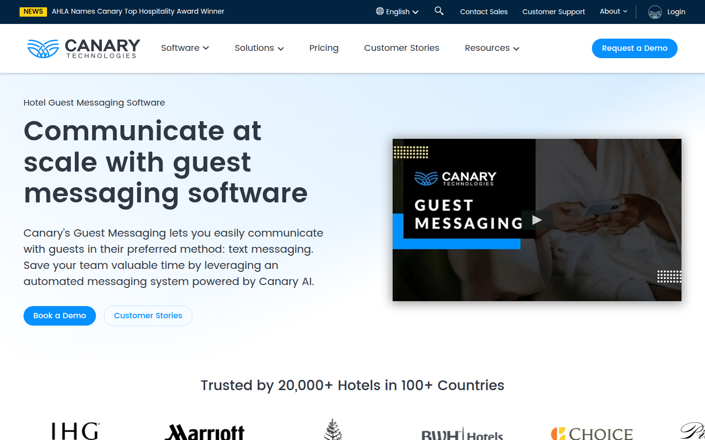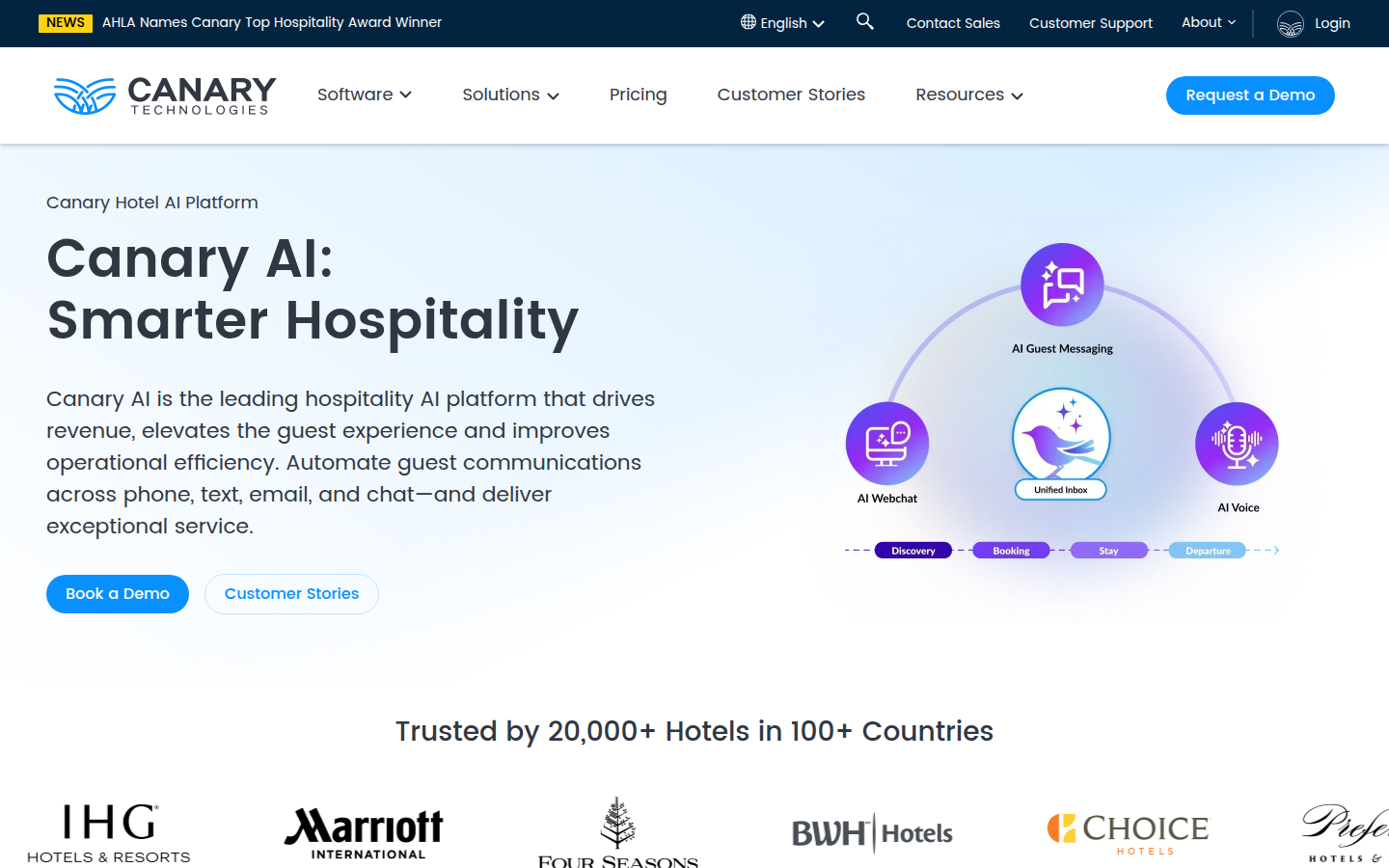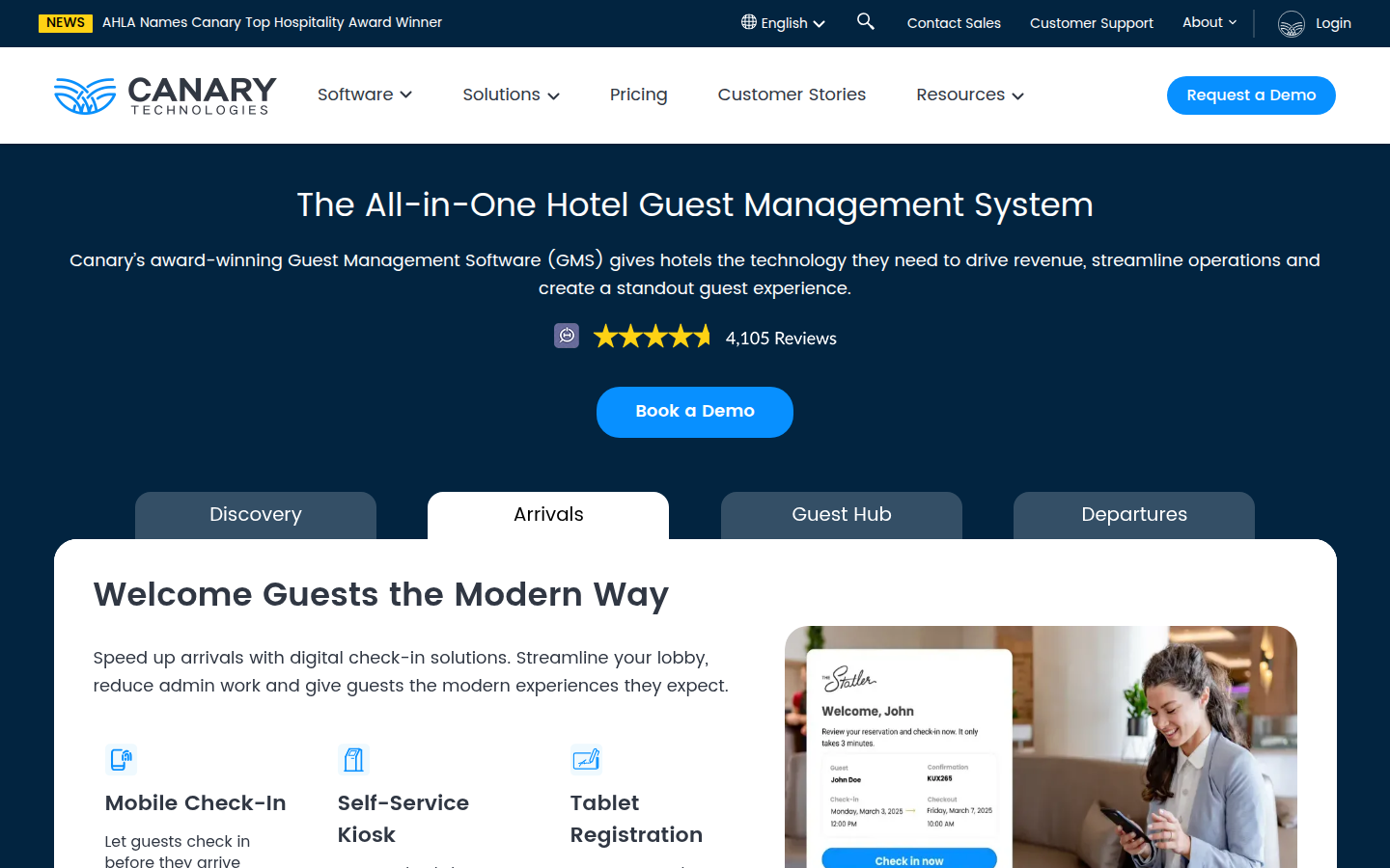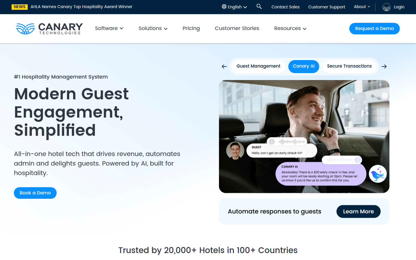 Canary Technologies is a leading hospitality technology company that provides an award-winning Guest Management System (GMS) designed specifically for hotels and hospitality businesses. The platform offers an all-in-one solution that combines guest management, AI-powered communication tools, and secure transaction processing to modernize hotel operations.