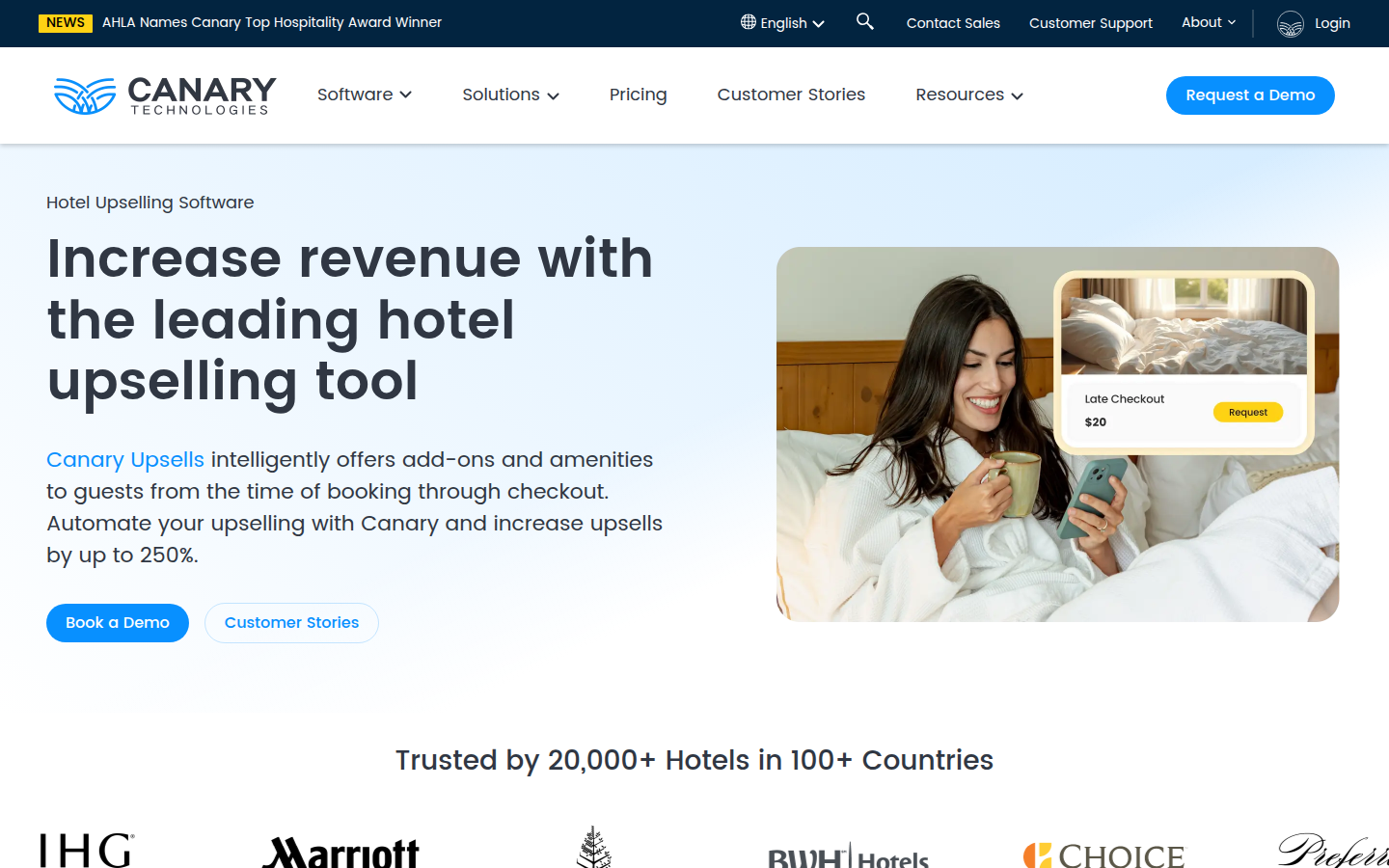 The company's comprehensive platform includes AI-driven solutions like AI Voice for call handling, AI Webchat for instant guest responses, and AI Guest Messaging for automated personalized communication. Canary also offers solutions for contactless check-in, dynamic upselling, digital tipping, smart checkout, and secure digital contracts and authorizations. The platform serves over 20,000 hotels across 100+ countries, helping properties increase revenue through upsells, reduce chargebacks by up to 90%, improve guest satisfaction scores, and streamline front desk operations. Canary integrates with major property management systems and other hospitality technology platforms to provide a seamless experience for hotel operators.
