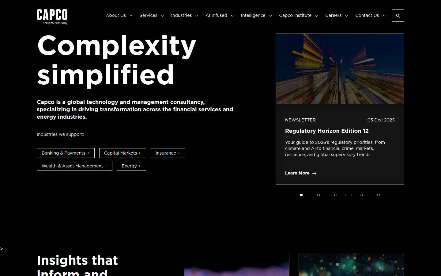 Capco serves major sectors including Banking & Payments, Capital Markets, Insurance, Wealth & Asset Management, and Energy. The company offers comprehensive services ranging from strategy and transformation to technology implementation, with particular focus on AI-infused solutions, regulatory compliance, and operational excellence. As part of Wipro, Capco leverages both boutique expertise and global scale to deliver distinctive solutions for complex business challenges.