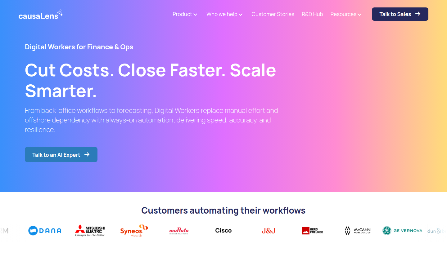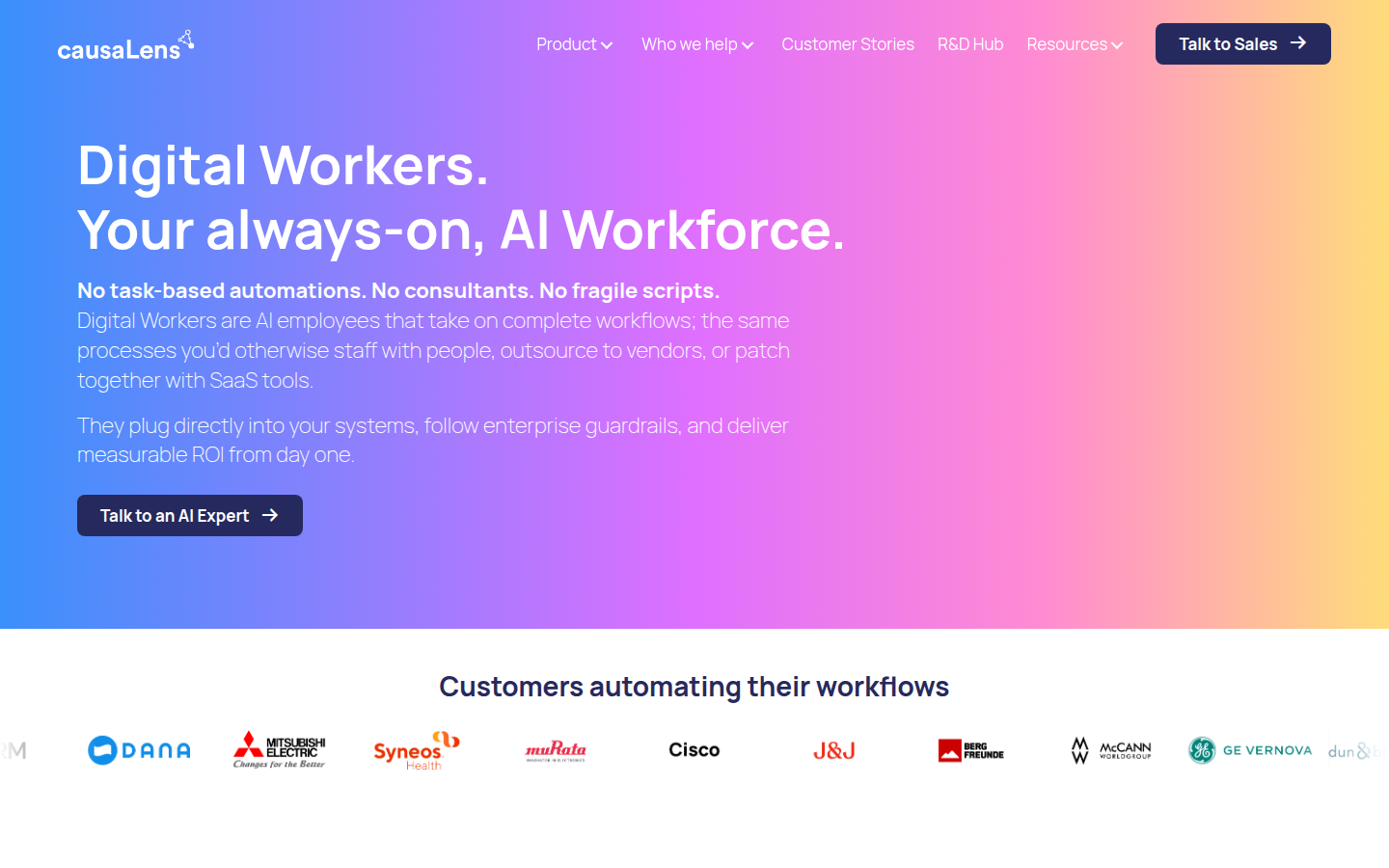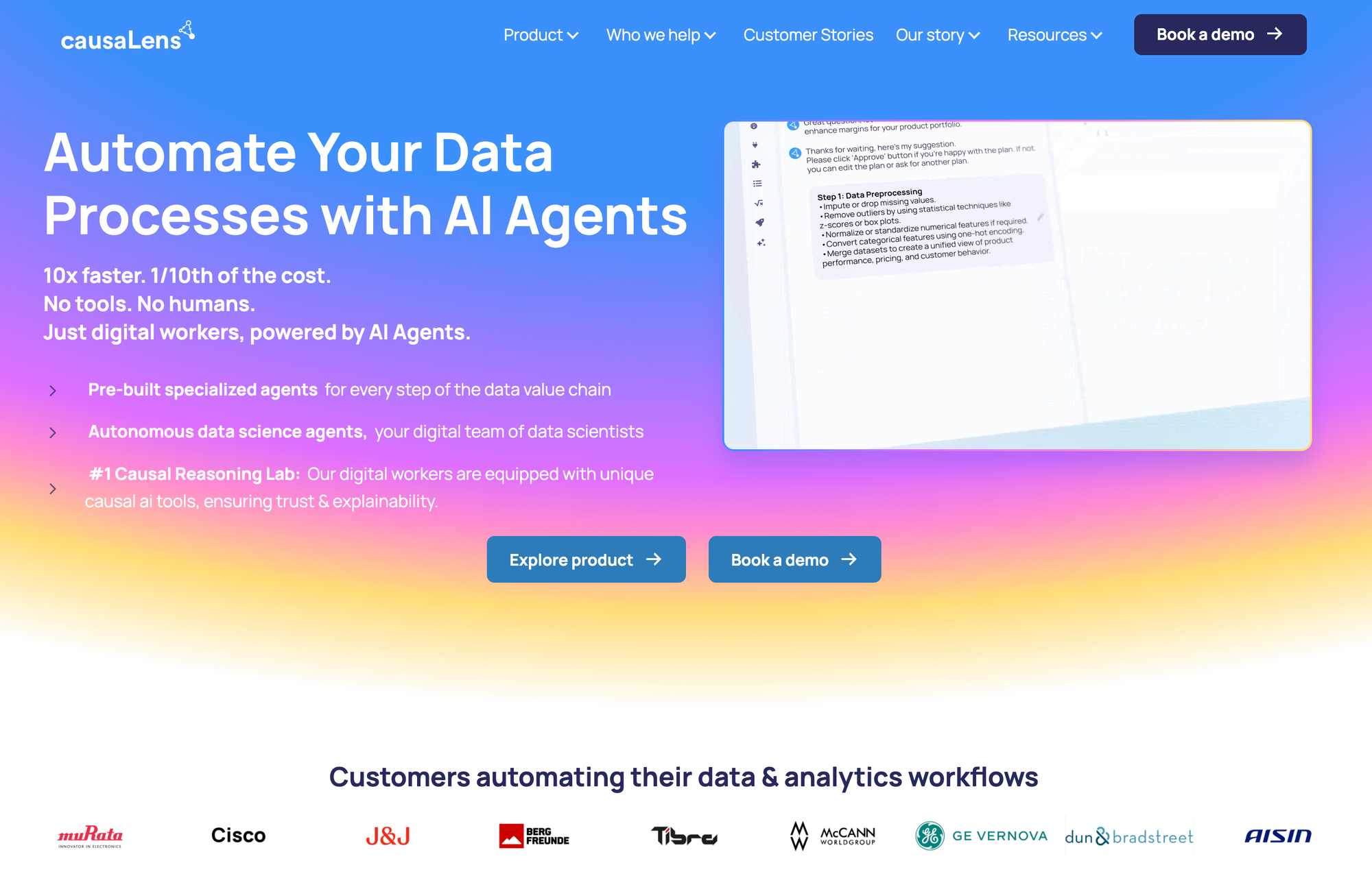 CausaLens provides an enterprise AI platform that creates "Digital Workers" - orchestrated sets of AI agents designed to automate complex, high-value business workflows. The company's platform enables organizations to replace traditional scaling methods (hiring, outsourcing, or adding more SaaS tools) with reliable digital labor that can handle end-to-end processes, make judgment calls within enterprise guardrails, and integrate seamlessly with existing systems.