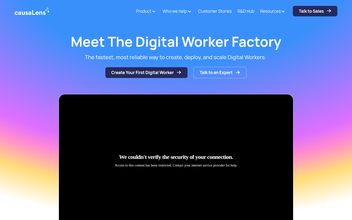 The platform consists of three core components: Blueprints (industry-tested templates), The Digital Worker Factory (deployment and customization system), and The System of Work (governance and management dashboard). CausaLens emphasizes reliability through continuous monitoring, compliance with standards like SOC 2, ISO, and HIPAA, and causal reasoning capabilities. The company serves multiple industries including pharmaceuticals, financial services, retail, and technology, with clients reporting an average 5x ROI from their Digital Worker implementations.