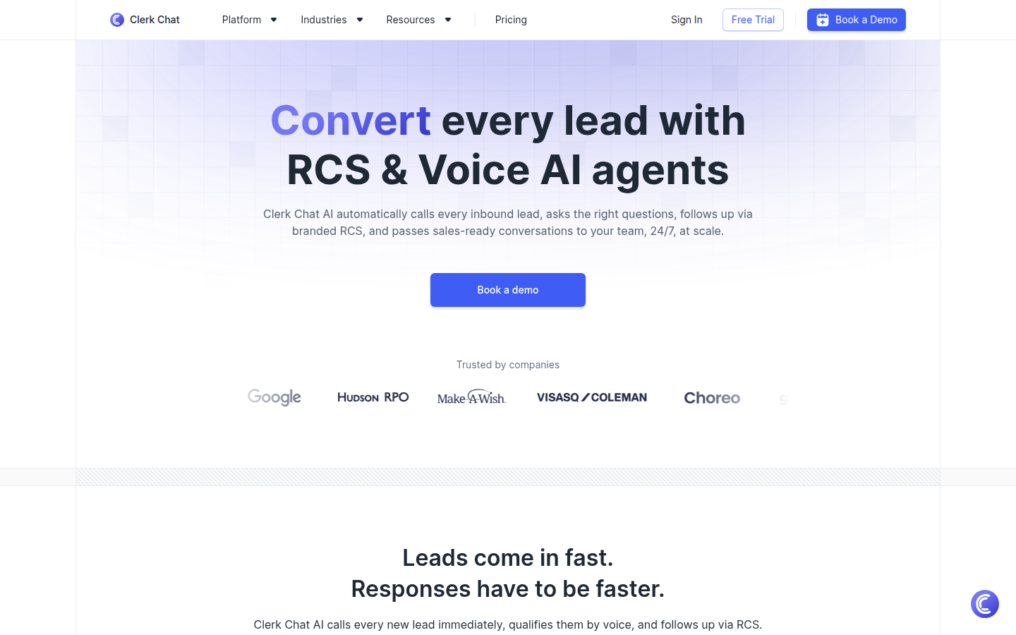 Clerk Chat is an AI-powered platform that provides automated lead qualification and engagement solutions for businesses. Their technology uses AI voice agents to immediately contact and screen inbound leads, conducting initial conversations and gathering key information. After the voice interaction, the platform follows up with interactive RCS messaging to keep leads engaged and move them through the sales funnel. The company's solution aims to help performance marketers improve lead response times, increase conversion rates, and scale customer communication.