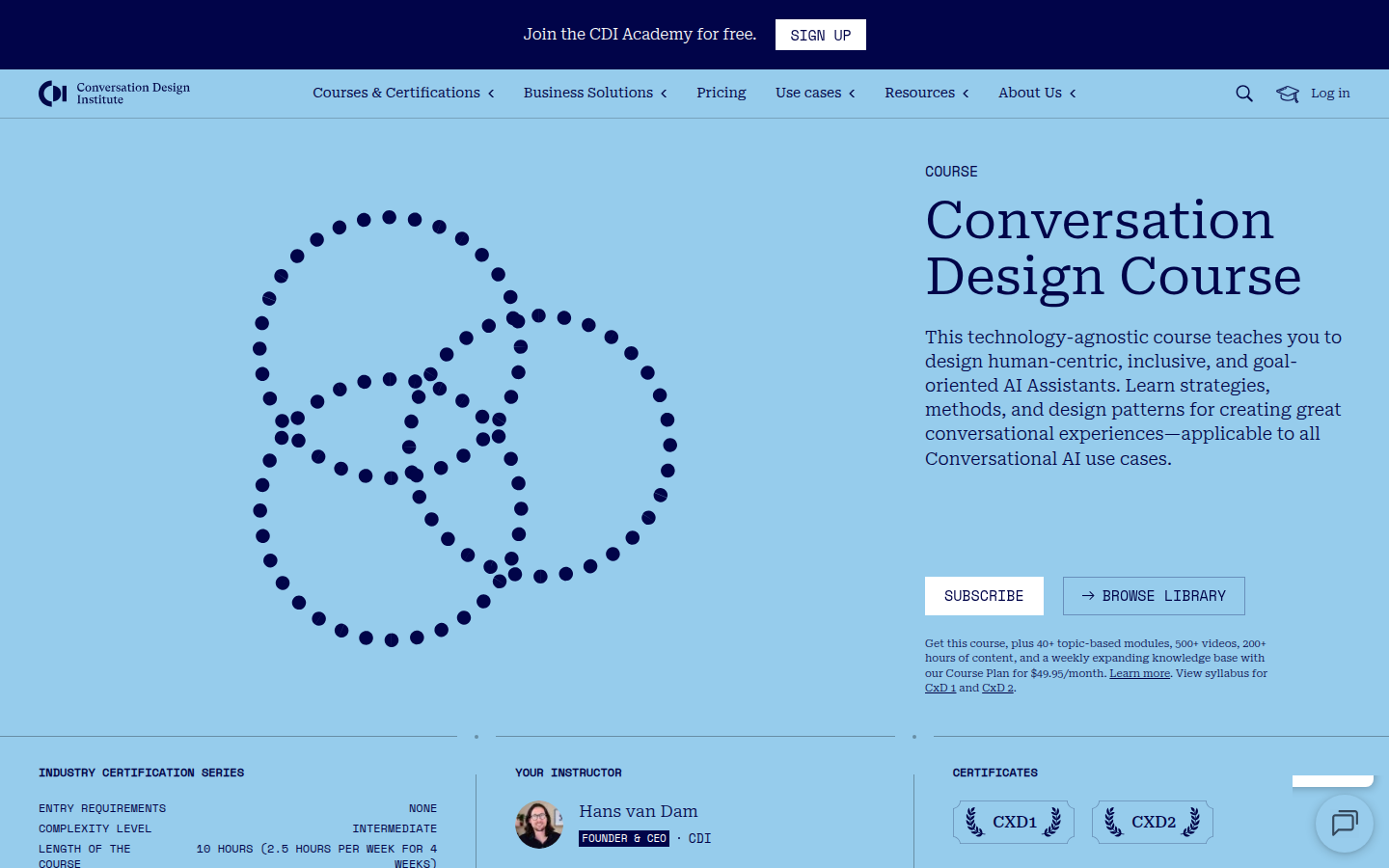 Conversation Design Institute (CDI) is an educational and consulting organization founded in 2018 by Hans van Dam and Olaf Igesz. The company specializes in training, certification, and consulting services for conversational AI design and implementation. CDI offers comprehensive courses including Conversation Designer certification, AI Trainer programs, and their proprietary CDI Method Foundation, serving professionals who build human-centric AI assistants.