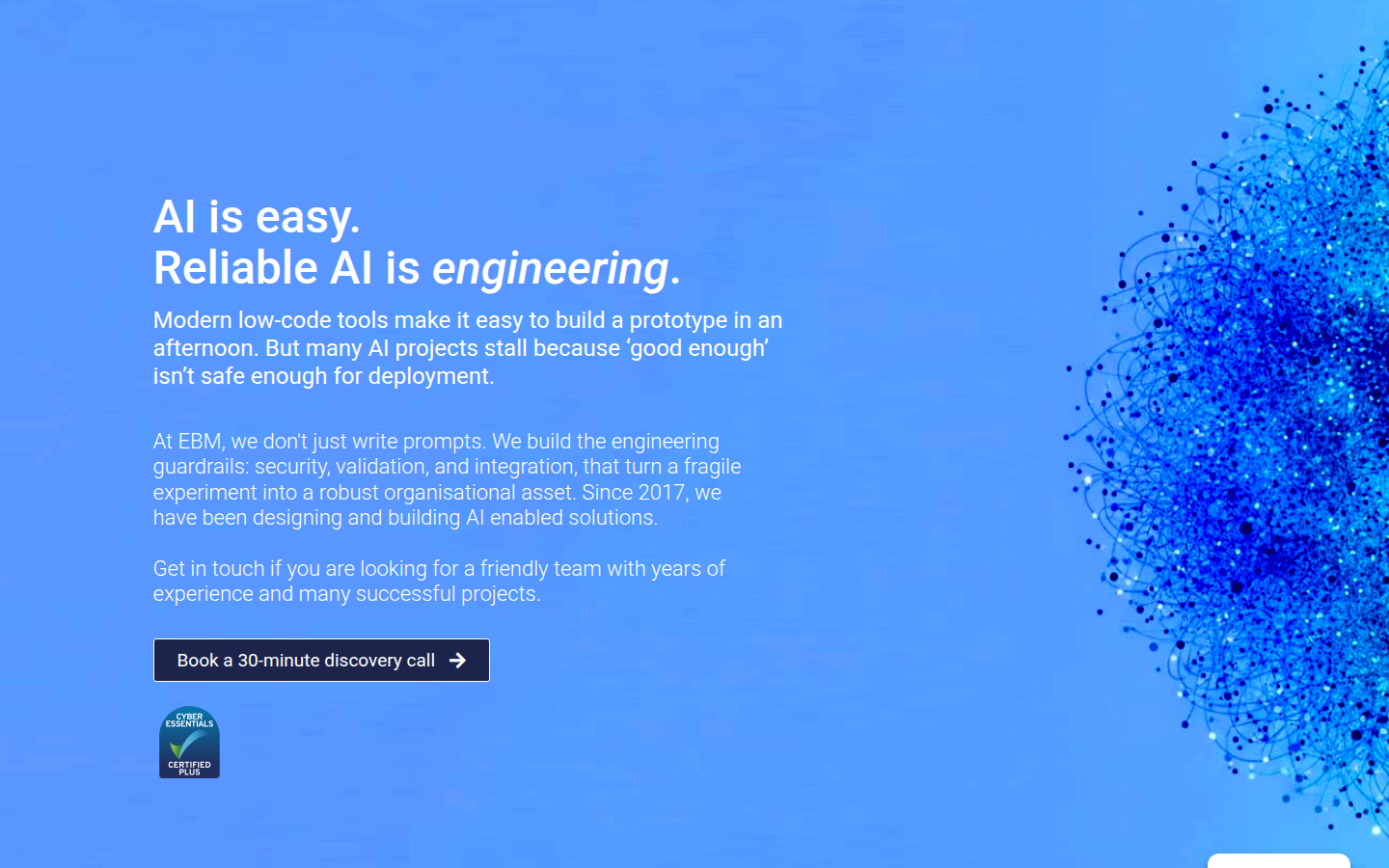 EBM is an AI consulting and development company that specializes in building production-grade AI solutions with proper engineering guardrails. Since 2017, they have been designing and building AI-enabled solutions that go beyond simple prototypes to deliver secure, validated, and integrated systems that become robust organizational assets.