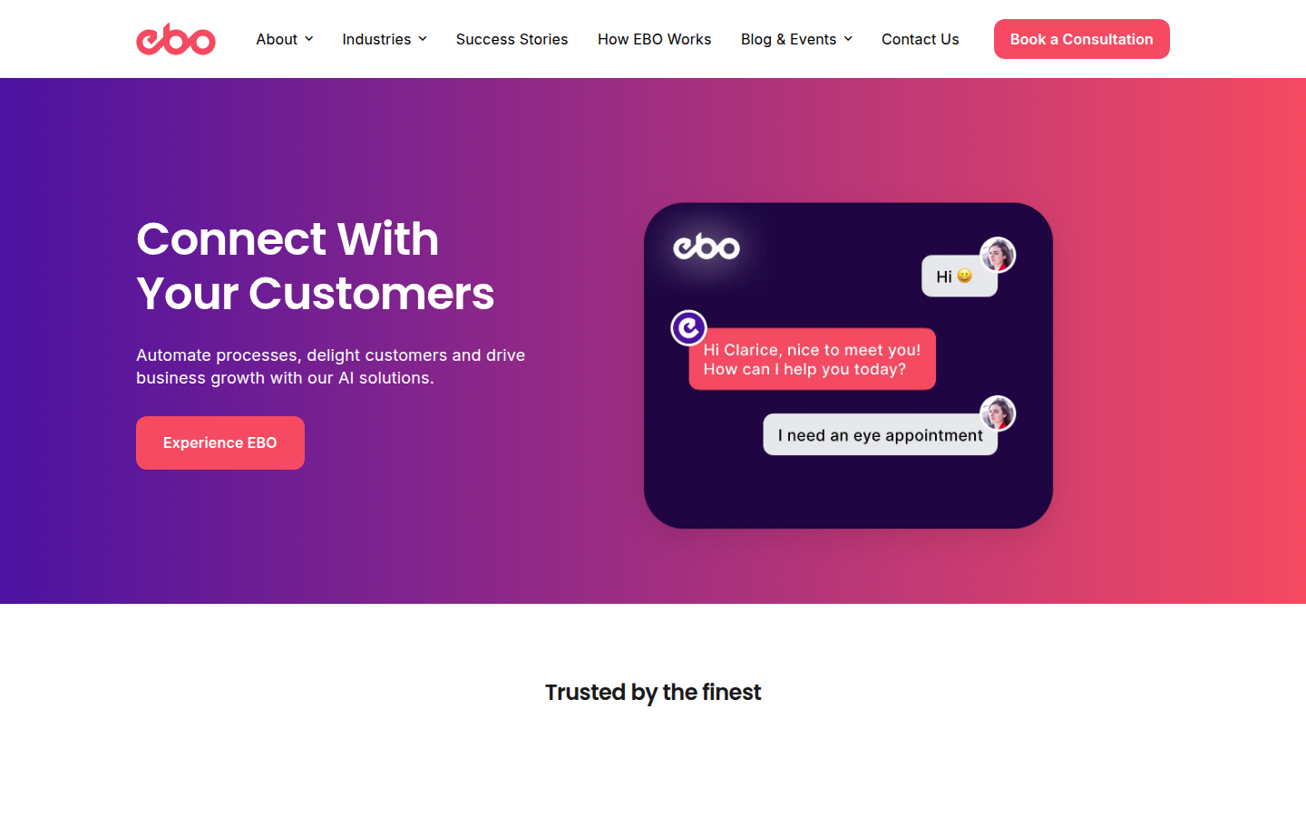 EBO is a conversational AI platform that specializes in automating high-volume, routine workflows through natural language processing and intelligent customer engagement solutions. The company leverages sophisticated Conversational AI and Generative AI technologies to help Healthcare and Financial Service providers communicate more effectively with their customers through multilingual, 24/7 automated dialogue across any channel.