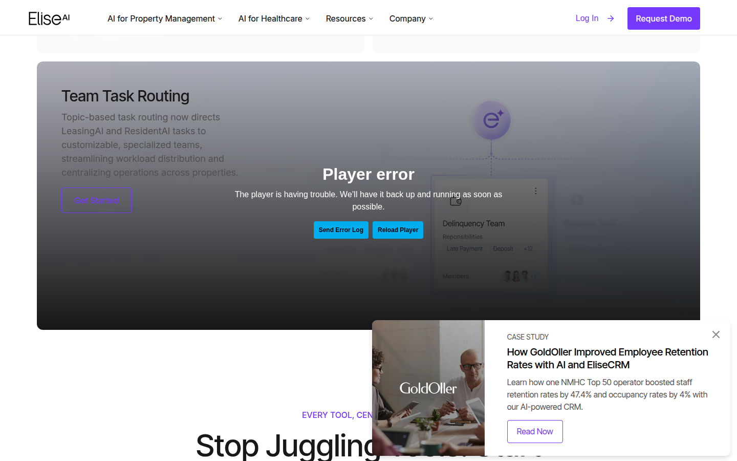 The platform automates workflows for property management companies and healthcare providers, handling tasks like prospect management, maintenance requests, renewals, and patient communications. EliseAI's solutions include VoiceAI for 24/7 phone support, prospect management systems, AI-guided tours, and integrated CRM capabilities. The company has raised $140M in funding and processes over 1.5 million customer interactions annually, with clients reporting significant operational efficiencies and cost savings through automated workflows.