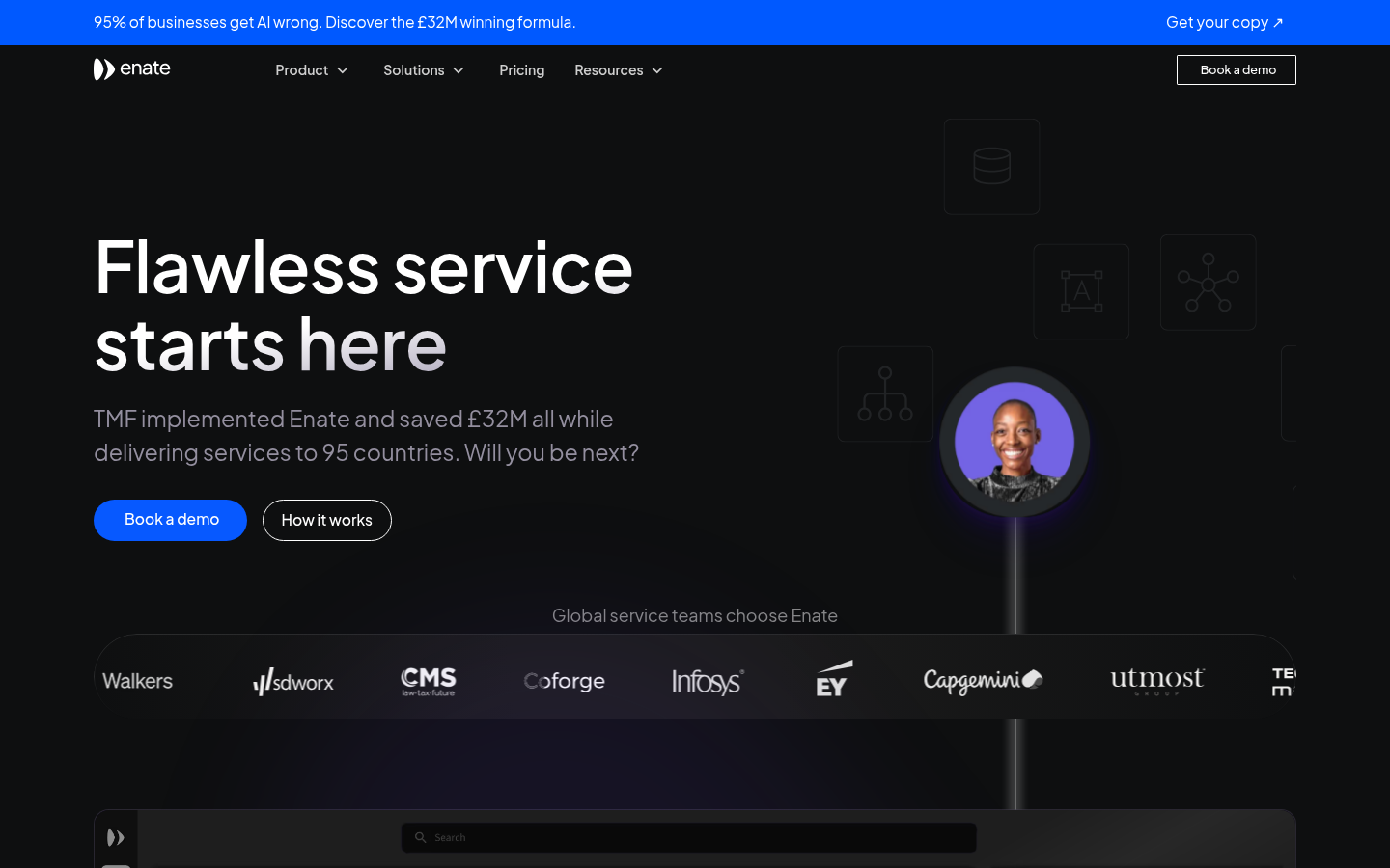 The platform is built to address common challenges in B2B services such as lack of visibility into operations, SLA management difficulties, and manual work processes. Enate offers a no-code, user-friendly solution that provides compliance features including ISO27001 certification, audit trails, and GDPR/HIPAA support. The company serves major clients including TMF, EY, and Capgemini, with documented results showing significant cost savings and operational efficiency improvements.