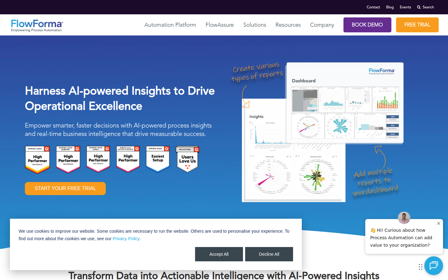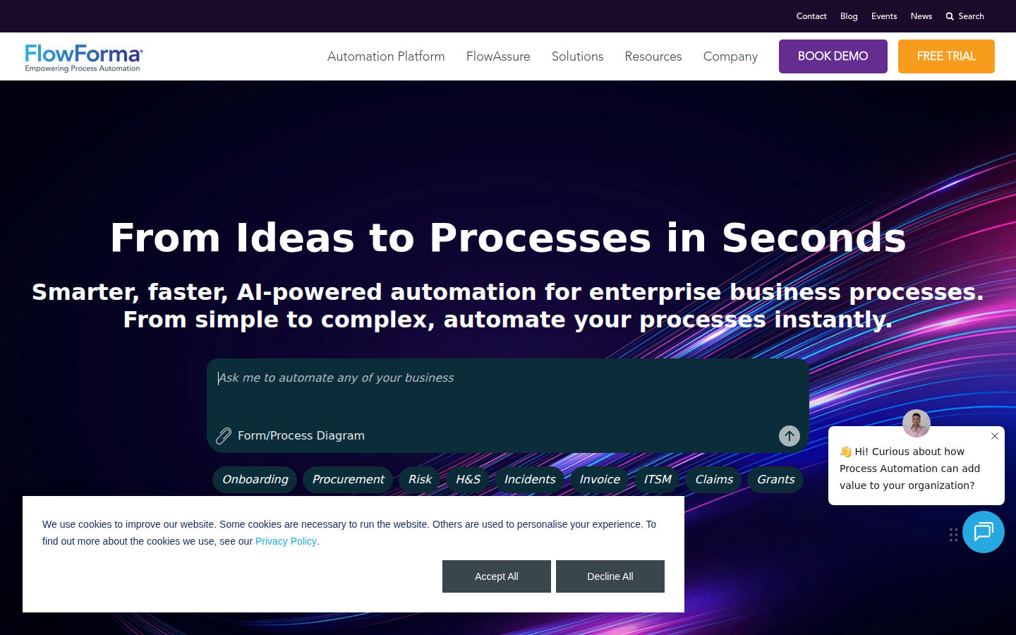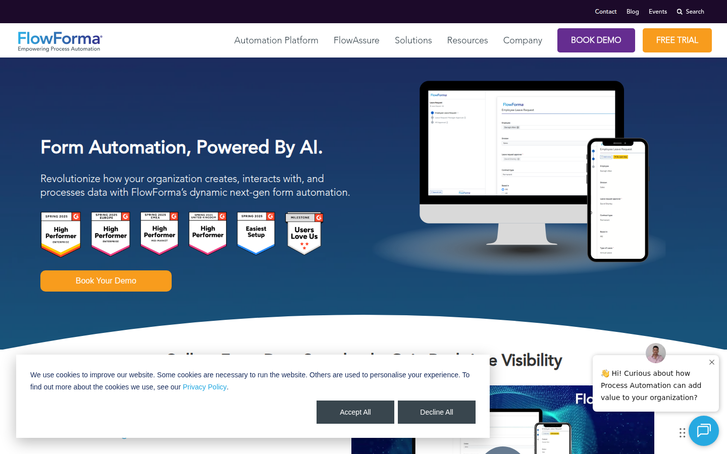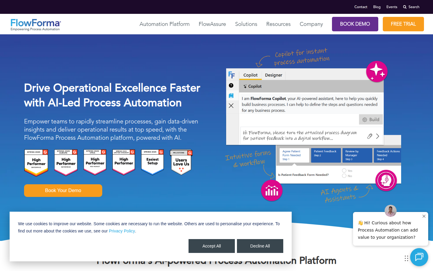 FlowForma is an AI-powered digital process automation platform that enables enterprises to automate business processes from simple to complex workflows. The platform features FlowForma Copilot, which allows users to build workflows instantly through conversational AI, and AI Agents that manage routine tasks such as approvals and data checks. The platform combines forms, workflow automation, insights, governance, document generation, and integrations in a single solution.