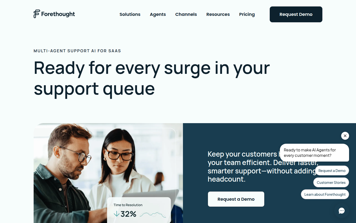 The platform is trained on each company's historical tickets and help center content to deliver accurate, personalized customer service from day one. Forethought's AI agents collaborate across the entire customer journey, identifying, solving, classifying, and supporting teams without added overhead. The company serves enterprise customers and reports impressive results including 15x average ROI, 55% reduction in first response time, and up to 98% resolution rates.