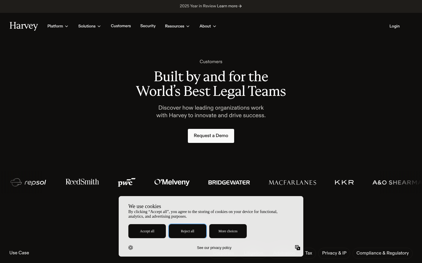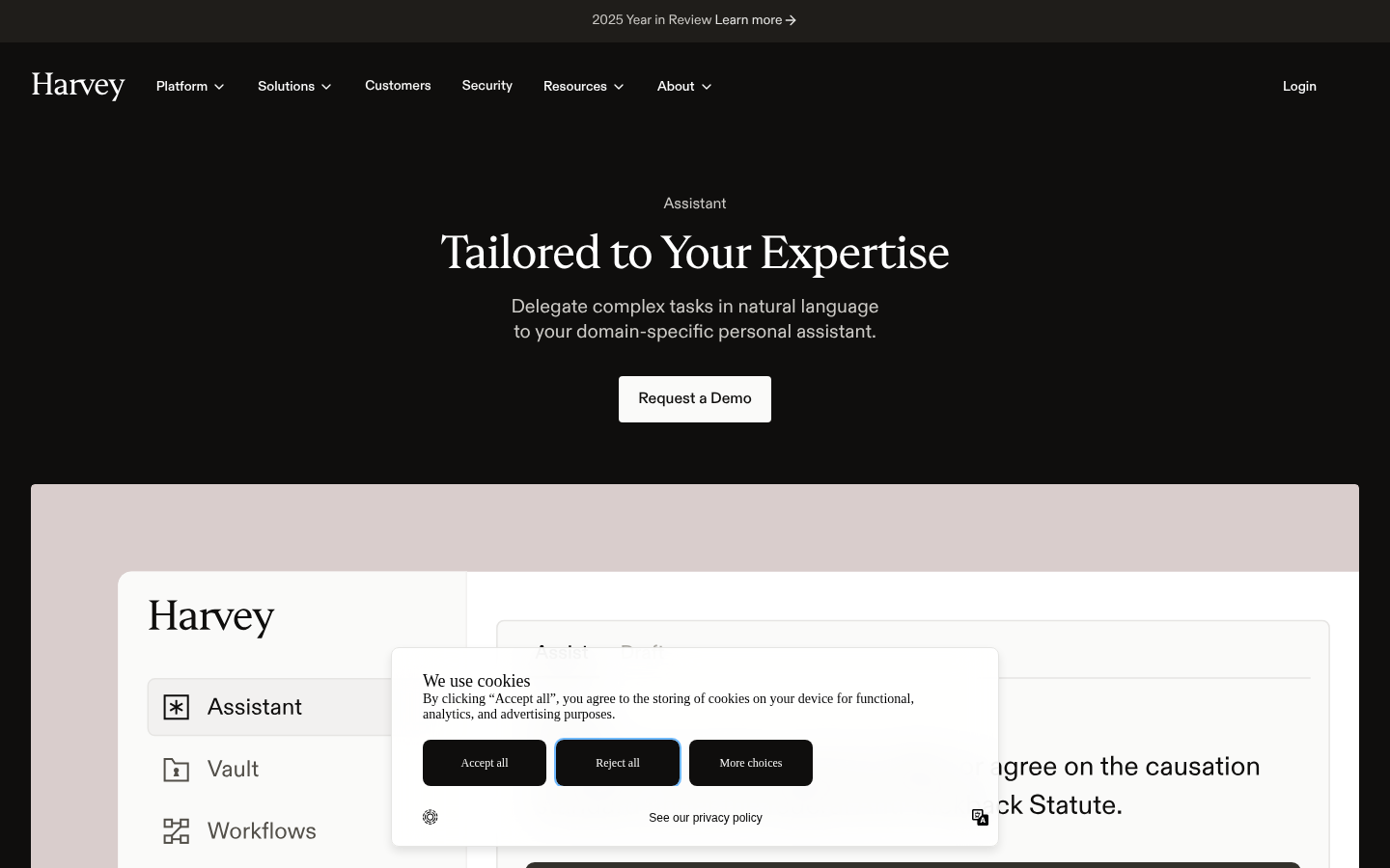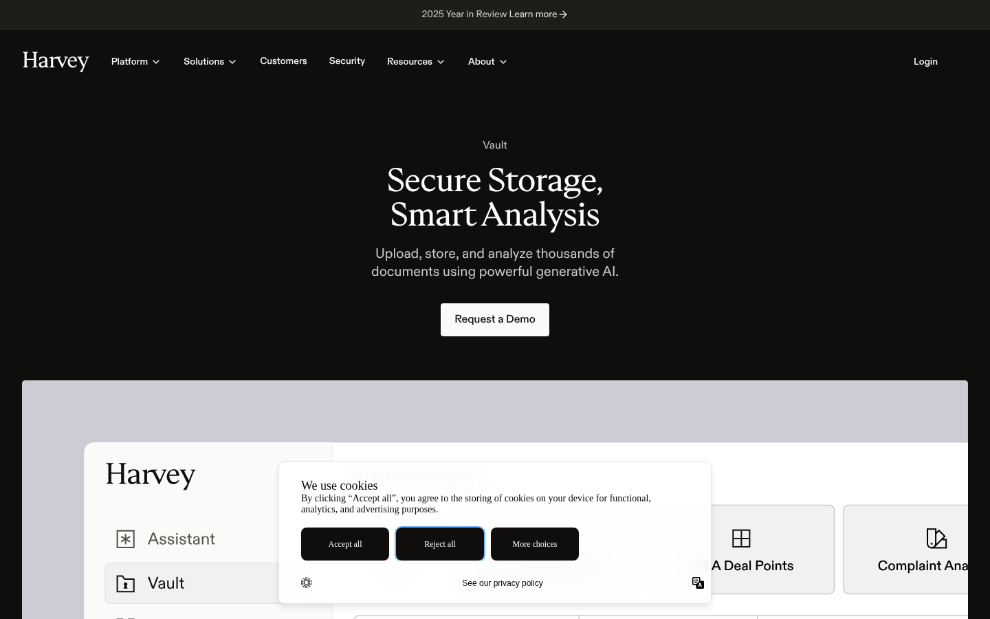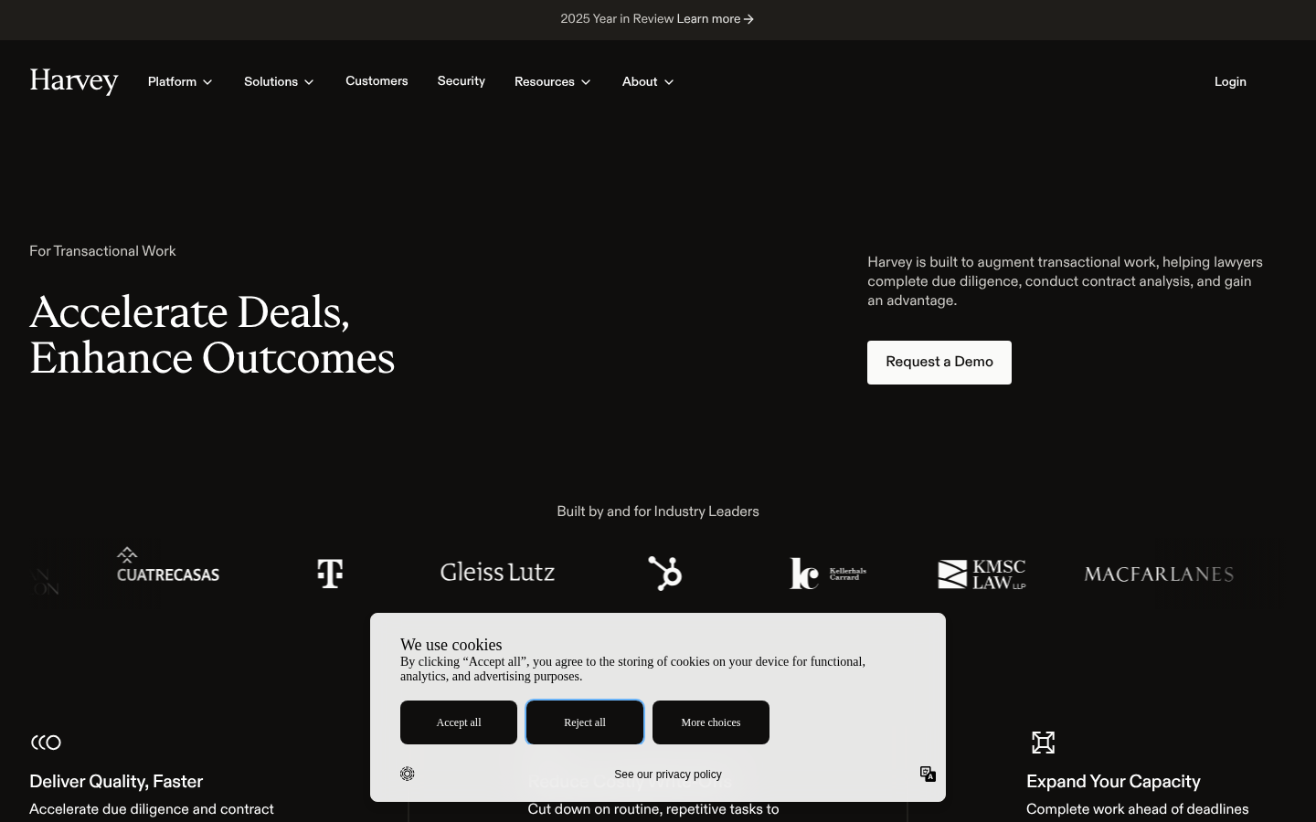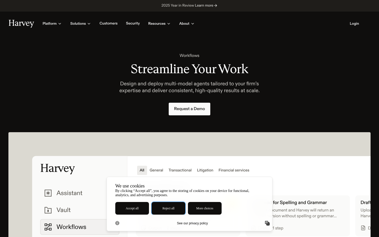 The company serves over 700 leading law firms and enterprises, including 50 of the AmLaw 100 firms, with more than 74,000 lawyers using the platform. Harvey's solutions span across various legal practice areas including transactional work, litigation, in-house counsel operations, and innovation teams. The platform emphasizes enterprise-grade security with zero training on client data, multi-model agentic workflows, and integrations with Microsoft Office tools including Word, Outlook, and SharePoint.