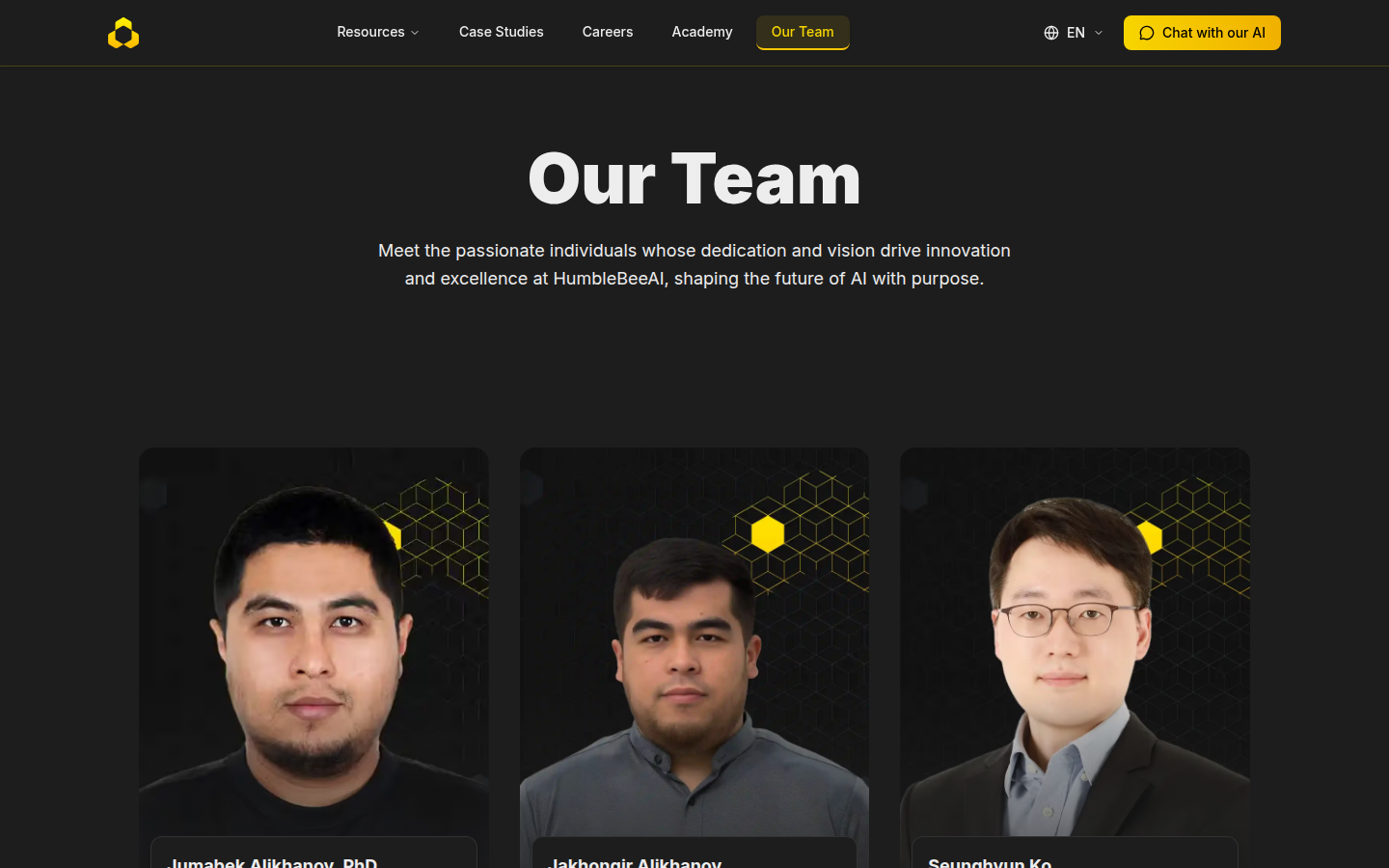 The company operates through multiple components including the Academy, Labs, and client engineering teams, following their "Ot va Chavandoz" (Horse and Rider) philosophy that emphasizes the need for both powerful AI tools and skilled human minds to guide them. HumbleBeeAI offers solutions ranging from advanced image recognition and analysis to custom AI implementations across various industries including agriculture and healthcare.