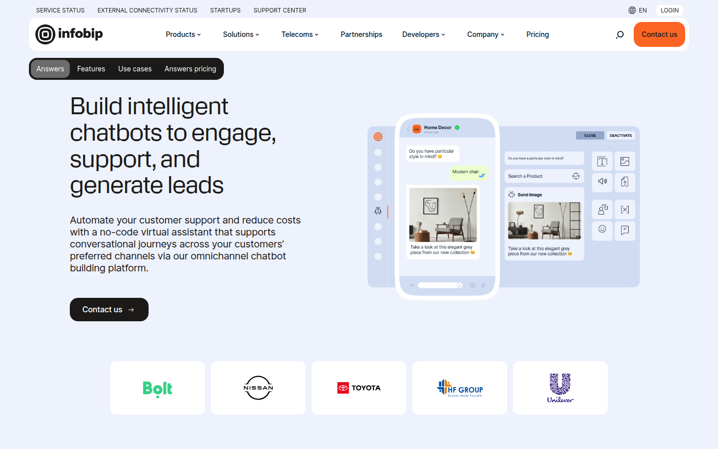 Infobip is a global cloud communications platform that provides omnichannel customer engagement solutions through conversational AI. The company offers a comprehensive suite of products including chatbot building platforms, cloud contact centers, customer data platforms, and generative AI tools through their Infobip AI Hub. Their platform enables businesses to communicate with customers across multiple channels including SMS, WhatsApp, voice, email, and other messaging apps through unified APIs.