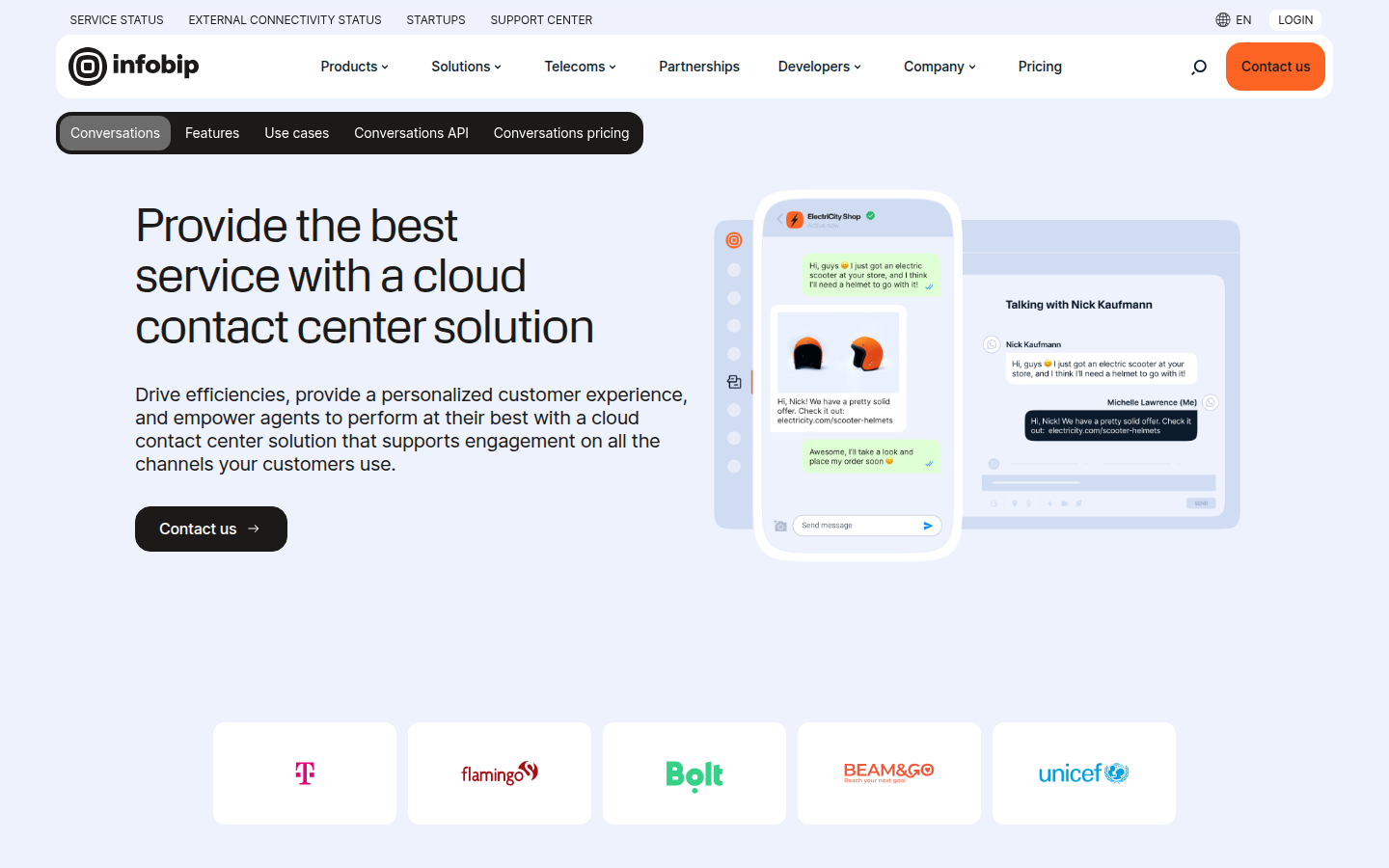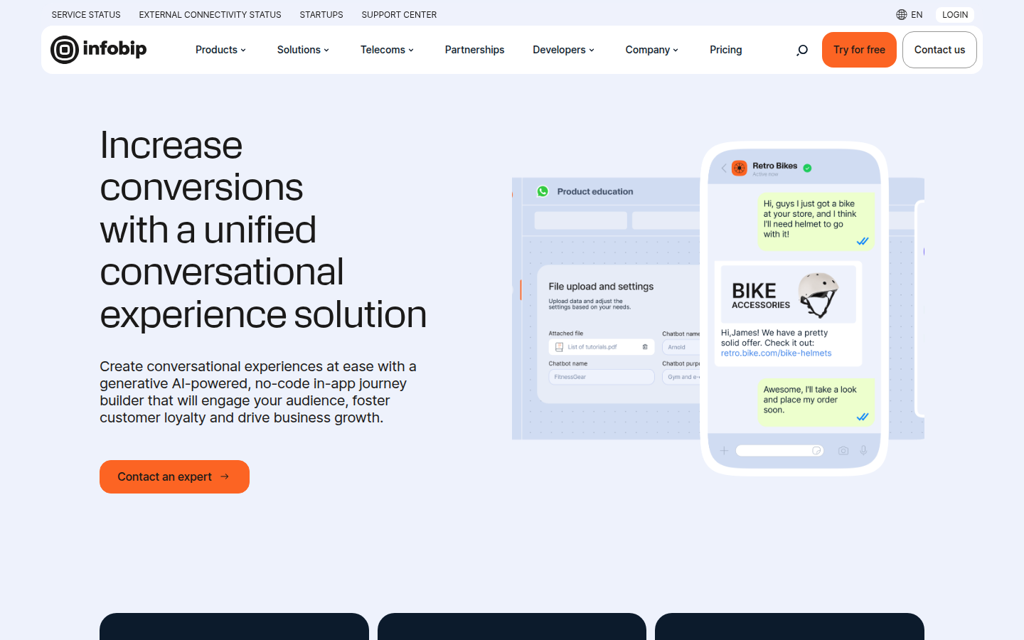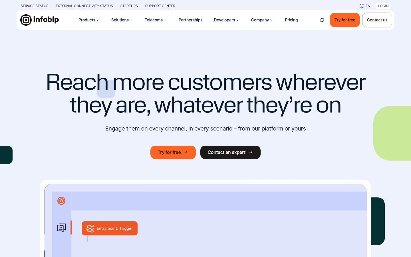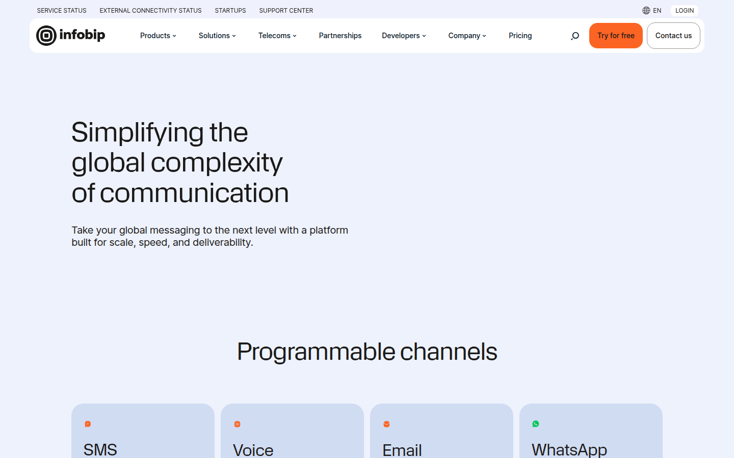 Infobip serves various industries including finance, healthcare, retail, telecommunications, and government with specialized conversational solutions. Their CPaaS (Communications Platform as a Service) offering provides businesses with programmable communication tools, authentication services, and network APIs. The platform emphasizes security, scalability, and AI-powered automation to help enterprises transform their customer experience and engagement strategies.