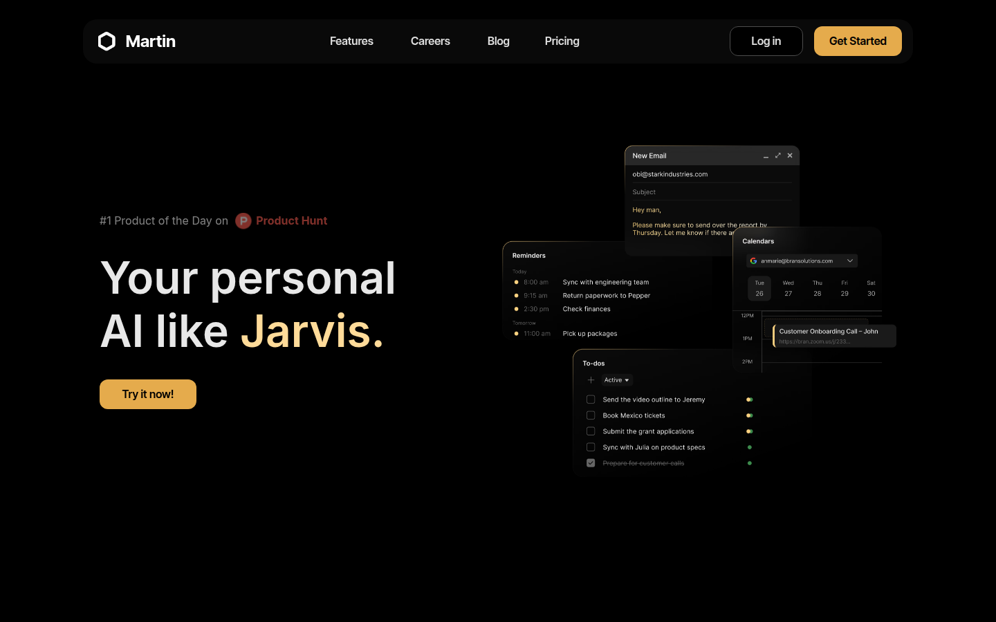 Martin is a personal AI assistant platform that functions as a comprehensive productivity tool, comparable to Jarvis from popular fiction. The platform integrates with users' existing applications including email, calendar, SMS, and Slack to automate routine tasks and manage daily workflows.
