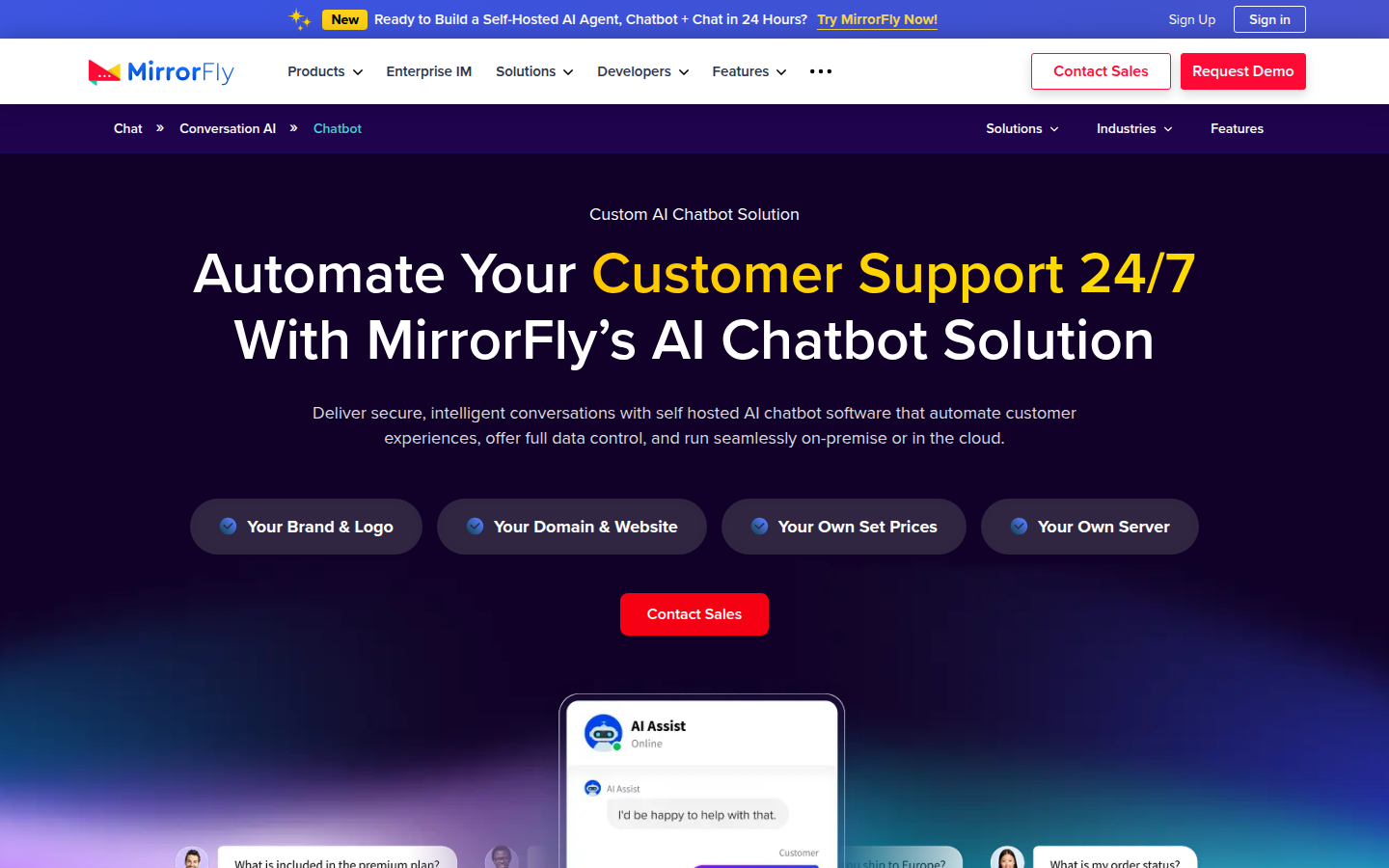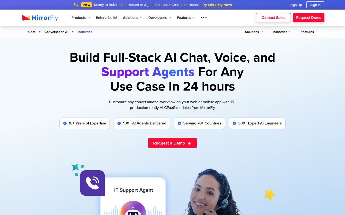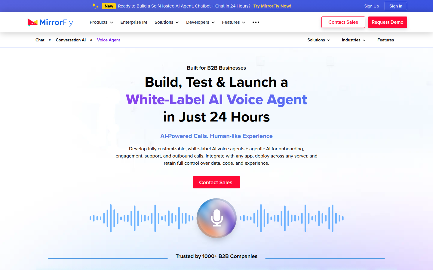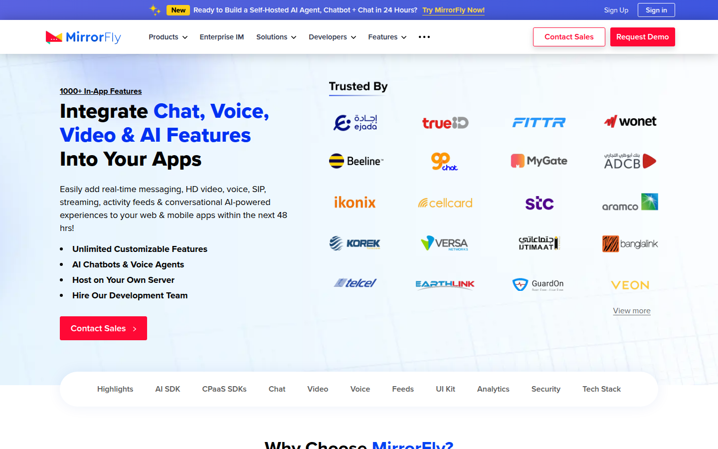 MirrorFly is a Communications Platform as a Service (CPaaS) provider that offers AI-powered communication APIs and SDKs for web and mobile applications. The company provides a comprehensive suite of communication tools including instant messaging, video calling, voice calling, AI chatbots, AI voice agents, and live streaming capabilities that can be integrated into any application.