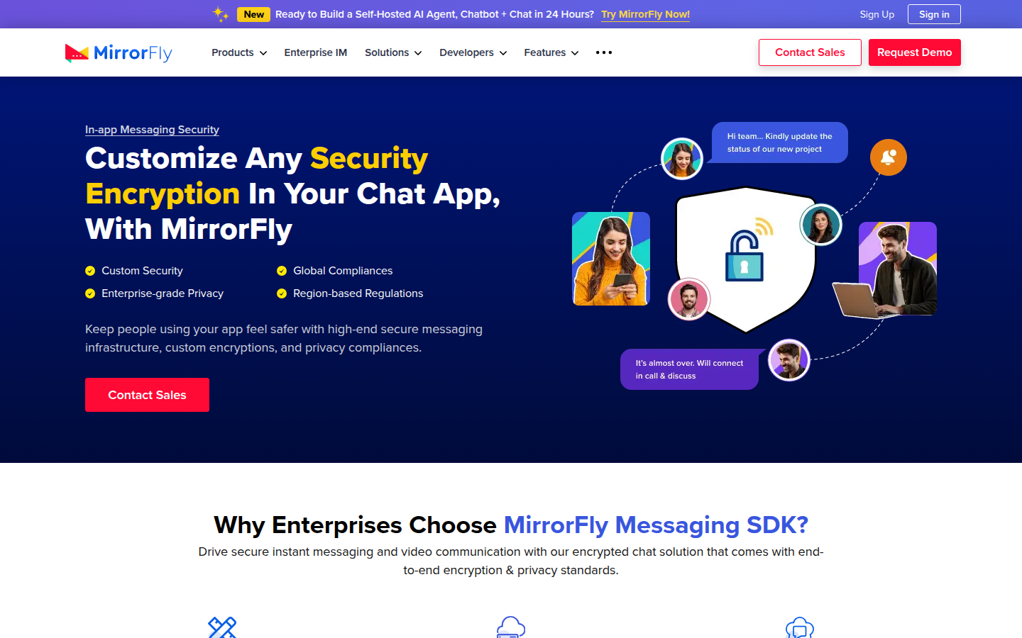 The platform serves over 1 billion concurrent users across 500+ live applications and offers 100% customizable solutions with full source code access. MirrorFly's enterprise-grade platform includes features like end-to-end encryption, multi-factor authentication, and compliance with HIPAA, GDPR, and OWASP standards. The company supports deployment anywhere, whether on-premises or cloud-based, and provides complete data ownership to its customers.