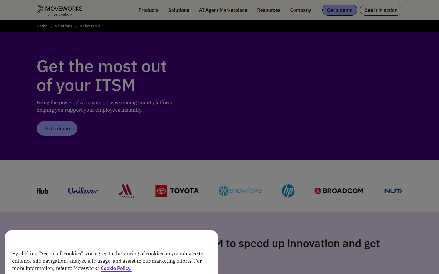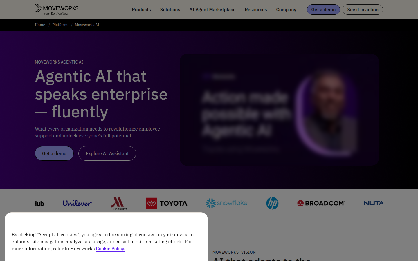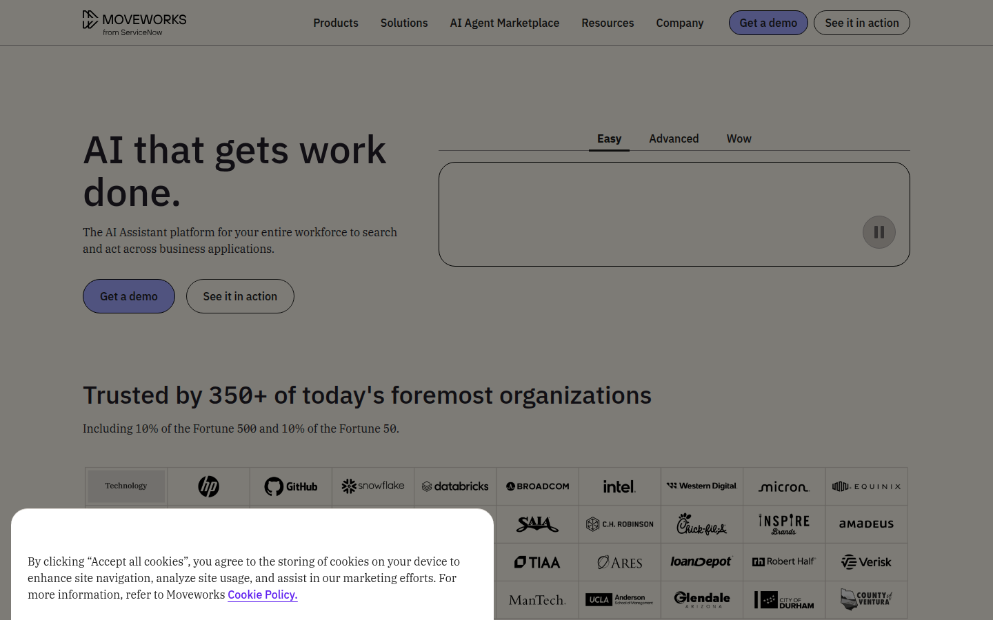 The company serves over 350 organizations including 10% of the Fortune 500, supporting more than 5 million employees across departments like HR, IT, Finance, Procurement, Engineering, Sales, and Marketing. Moveworks offers customizable AI agents, integrates with thousands of plugins, operates in over 100 languages, and provides omnichannel support across chat, browsers, intranets, and service portals. The platform is designed for enterprise-scale deployment with built-in security compliance including ISO 27001, SOC 2, HIPAA, GDPR, and FedRAMP certifications.