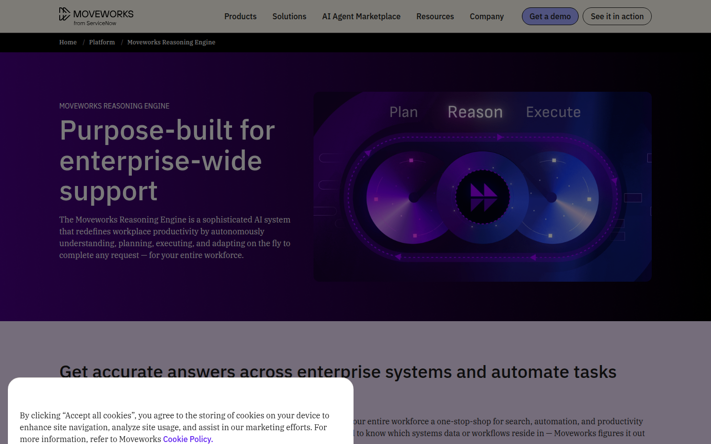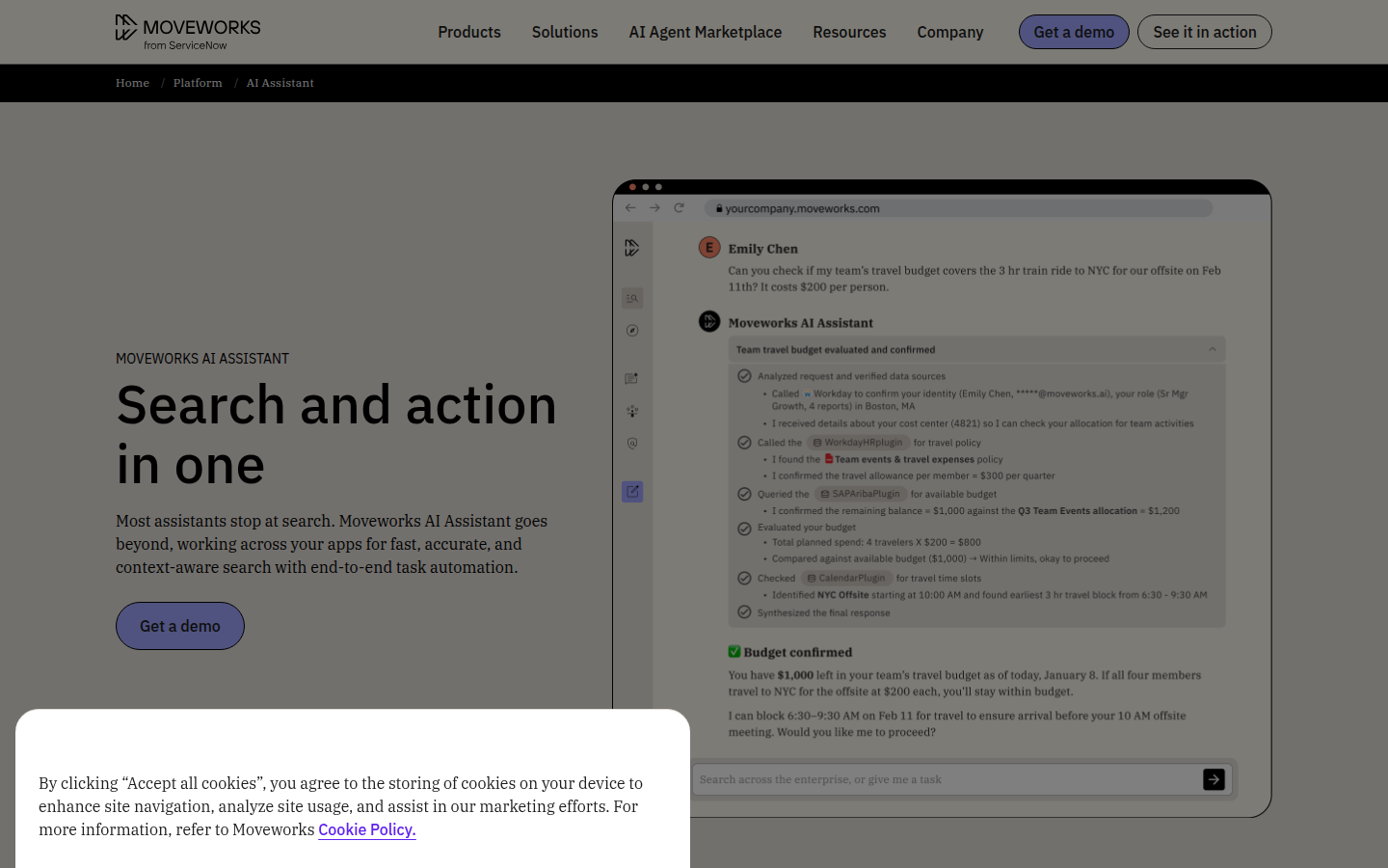 Moveworks is an enterprise AI Assistant platform that enables employees to search and take action across business applications through a unified interface. The platform goes beyond traditional search capabilities by offering end-to-end task automation powered by their proprietary Reasoning Engine, which autonomously understands, plans, executes, and adapts to complete requests within organizational workflows.