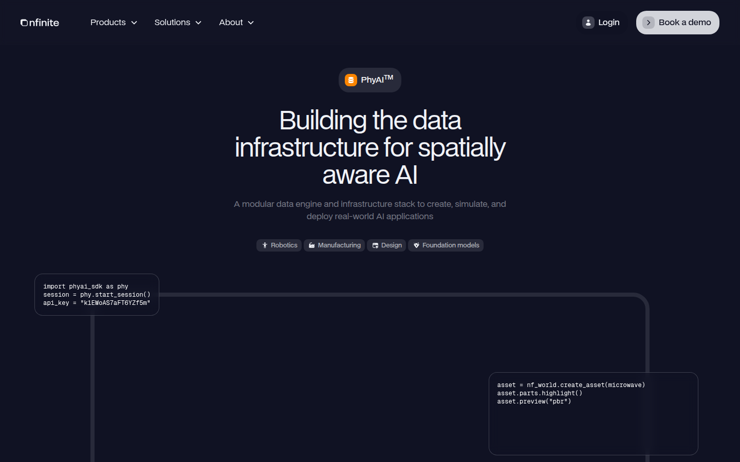 Nfinite operates PhyAI, a modular data engine and infrastructure stack designed to create, simulate, and deploy real-world AI applications. The company specializes in helping AI systems perceive and interact with the physical world through procedural generation and deep annotation of 3D assets.