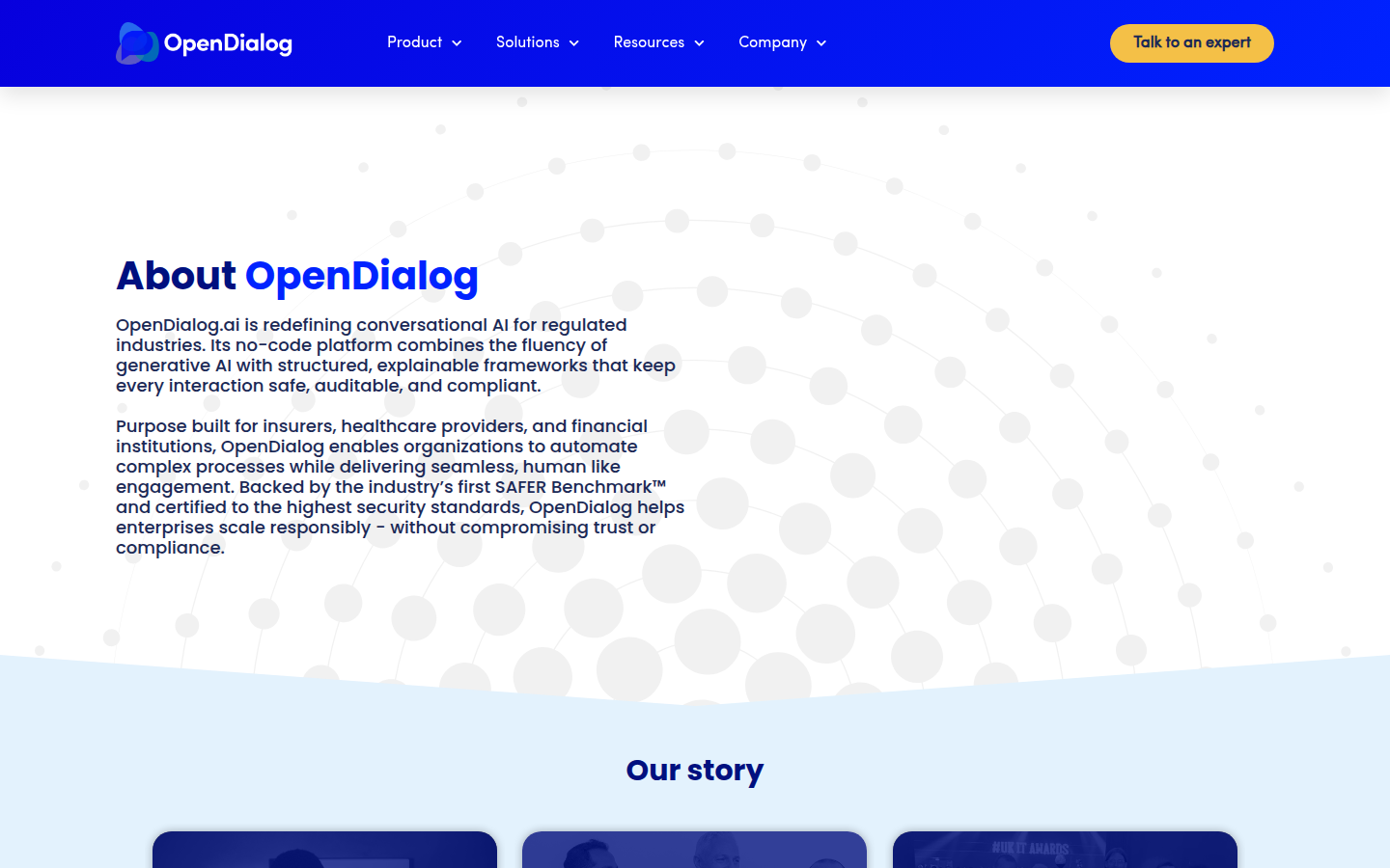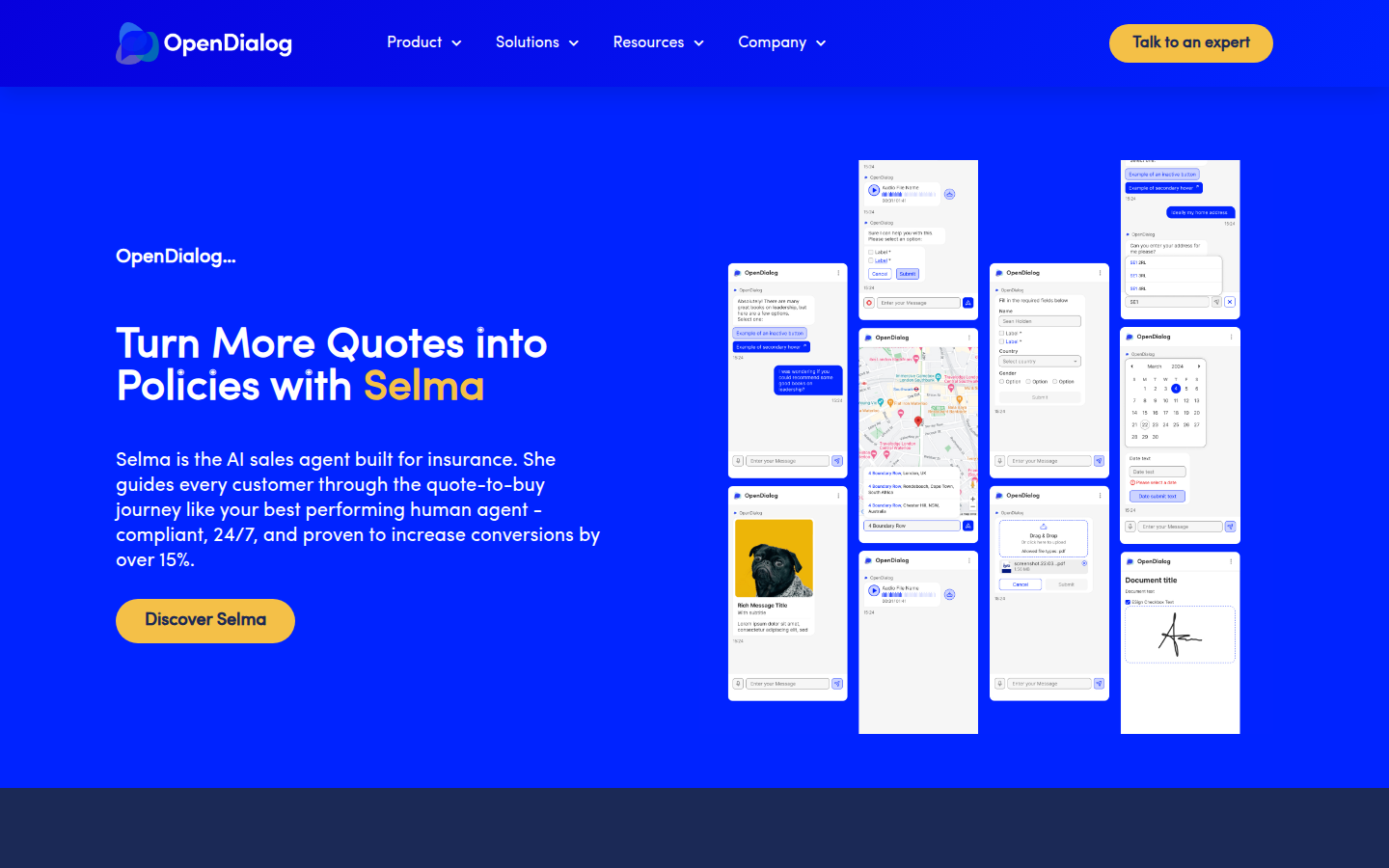 OpenDialog is an AI Agent Management System that provides autonomous AI agents specifically designed for regulated industries. The company's flagship product, Selma, is an AI sales agent built for insurance that guides customers through quote-to-buy journeys 24/7, proven to increase conversions by over 15% and improve customer satisfaction by 40%.
