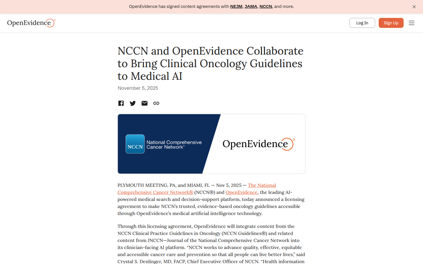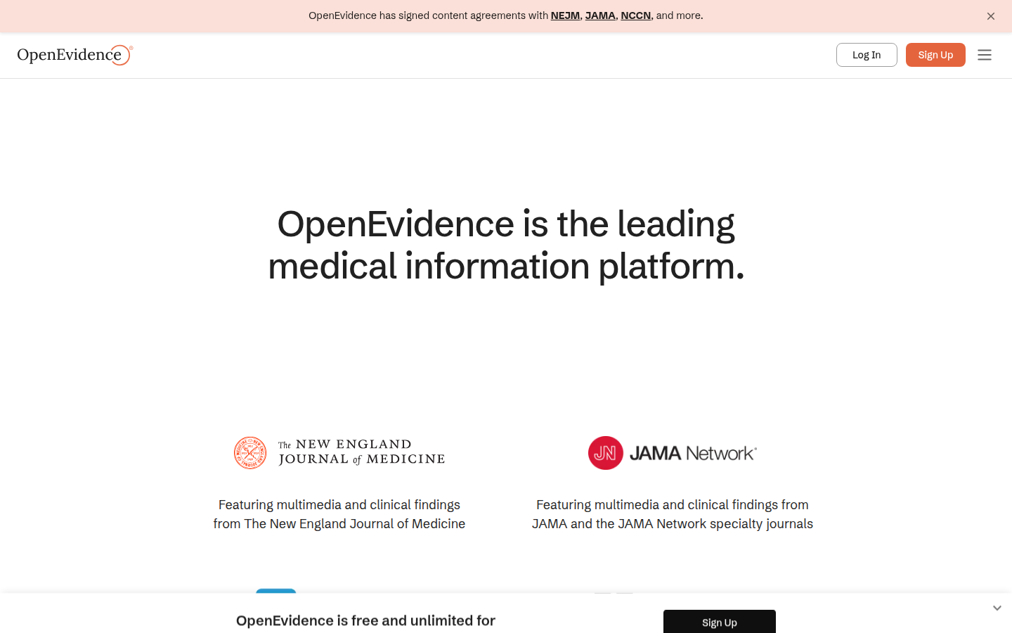 OpenEvidence is a medical information platform that provides healthcare professionals with access to clinical findings and multimedia content from leading medical publications. The platform features content from prestigious sources including The New England Journal of Medicine, JAMA and the JAMA Network specialty journals, and NCCN Guidelines from the National Comprehensive Cancer Network.