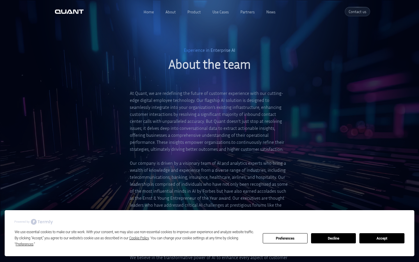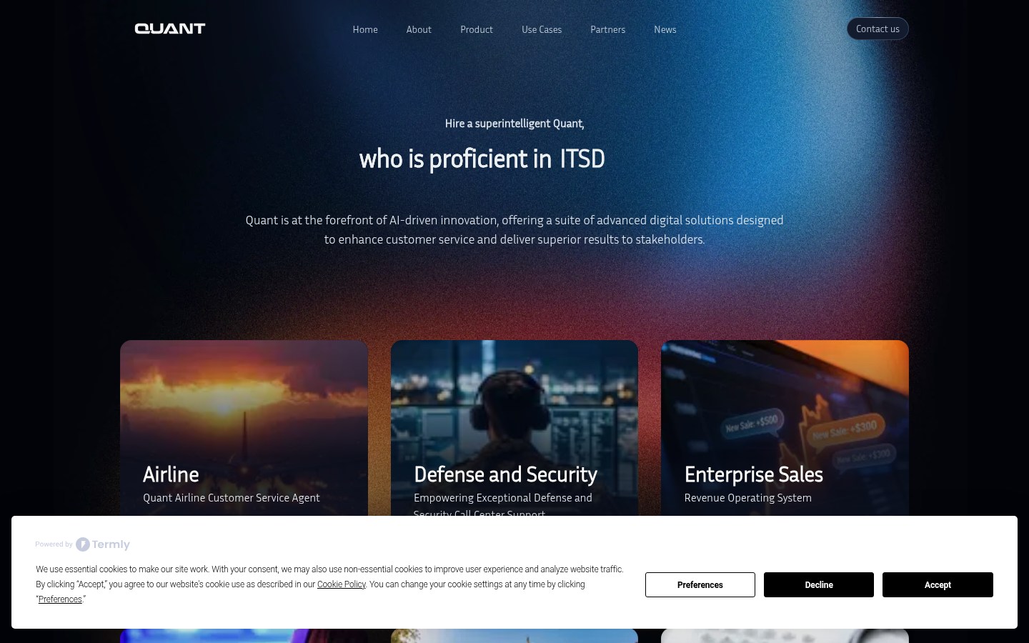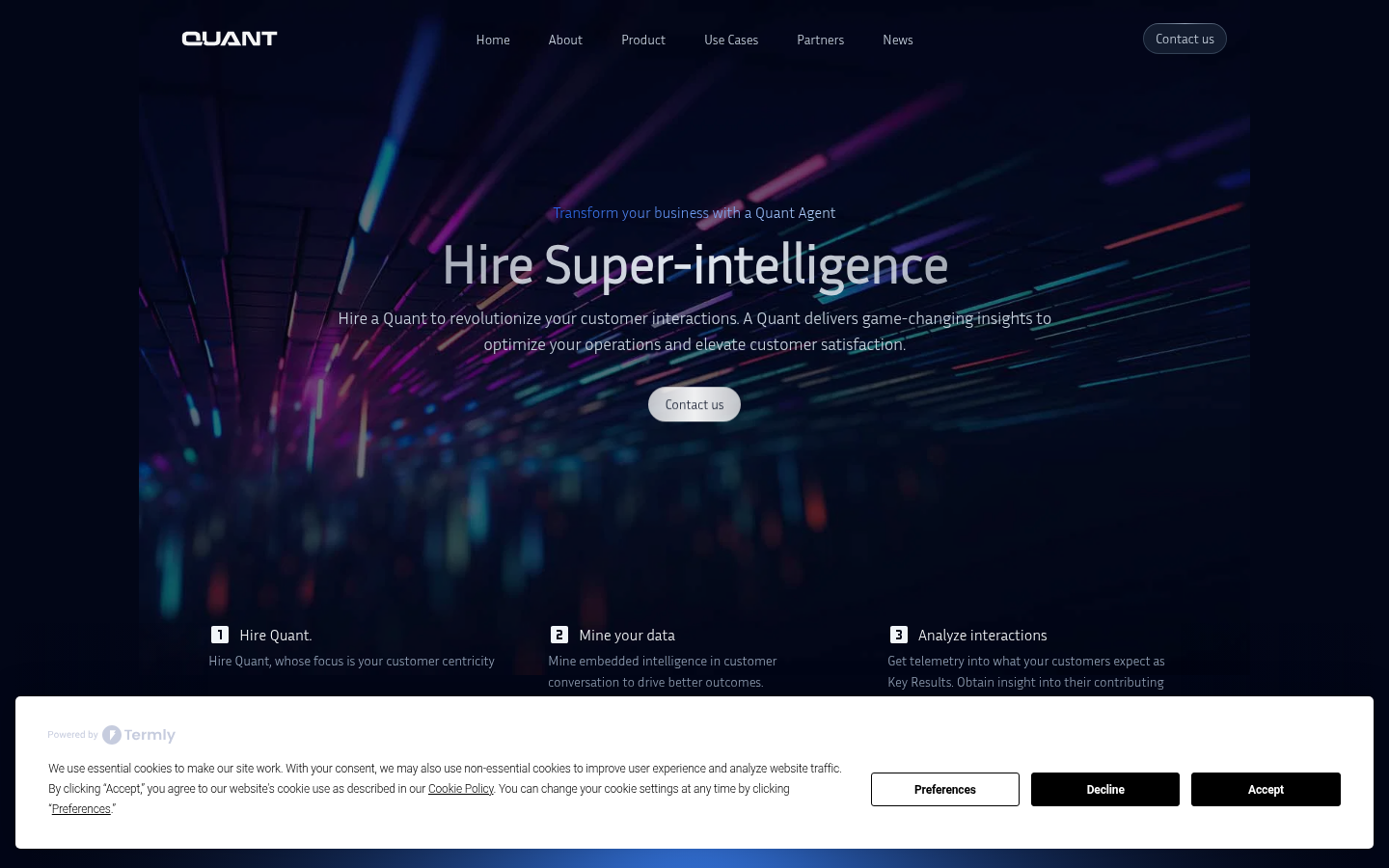Quant provides AI agent solutions that deliver insights to optimize operations and enhance customer satisfaction. The platform features human-like cognition with reinforced learning capabilities, LLM-agnostic integration with various AI models, and multimodal/multilingual communication support. Key products include Quant Agent (AI-powered conversational system), Decision AI (real-time insights), Predictive Analytics, and Omnichannel I/O for synchronous and asynchronous communication. Serving over 200 leading enterprises worldwide.