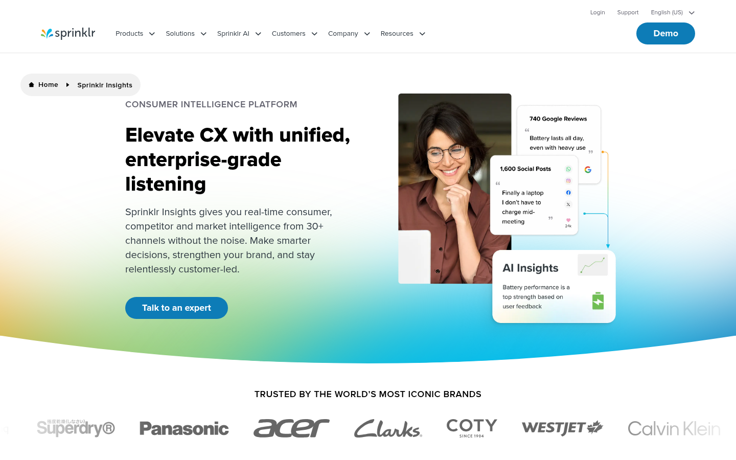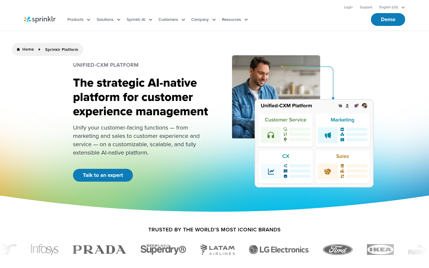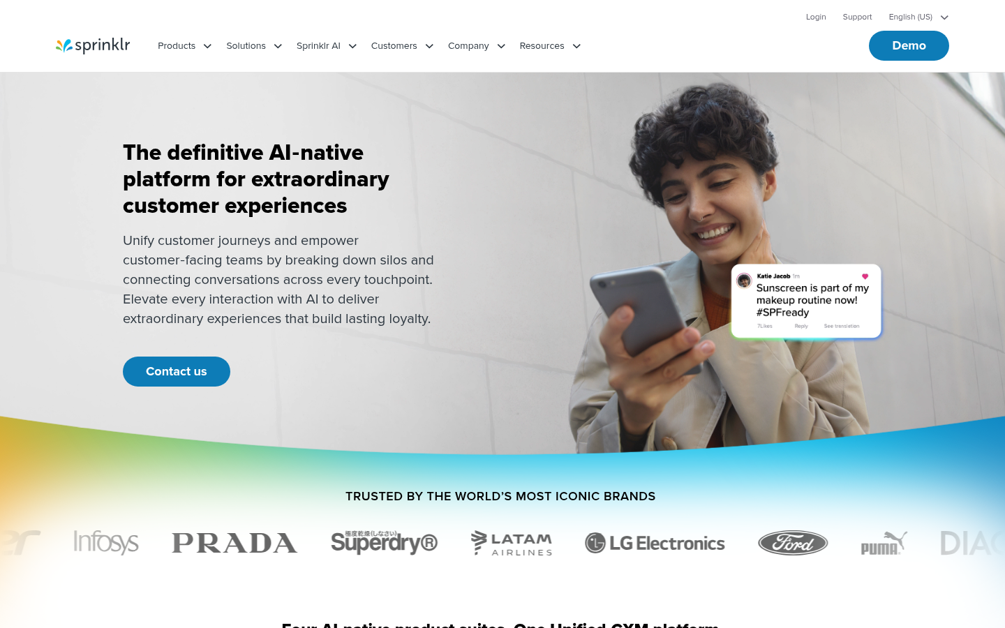 Sprinklr is an AI-native customer experience management (CXM) platform that unifies customer interactions across all digital touchpoints. The company offers four integrated product suites: Sprinklr Service for omnichannel customer support, Sprinklr Social for social media management across 30+ channels, Sprinklr Insights for real-time consumer and market intelligence, and Sprinklr Marketing for global campaign orchestration. Built on a unified platform architecture, Sprinklr breaks down organizational silos to enable seamless collaboration between marketing, service, and CX teams.