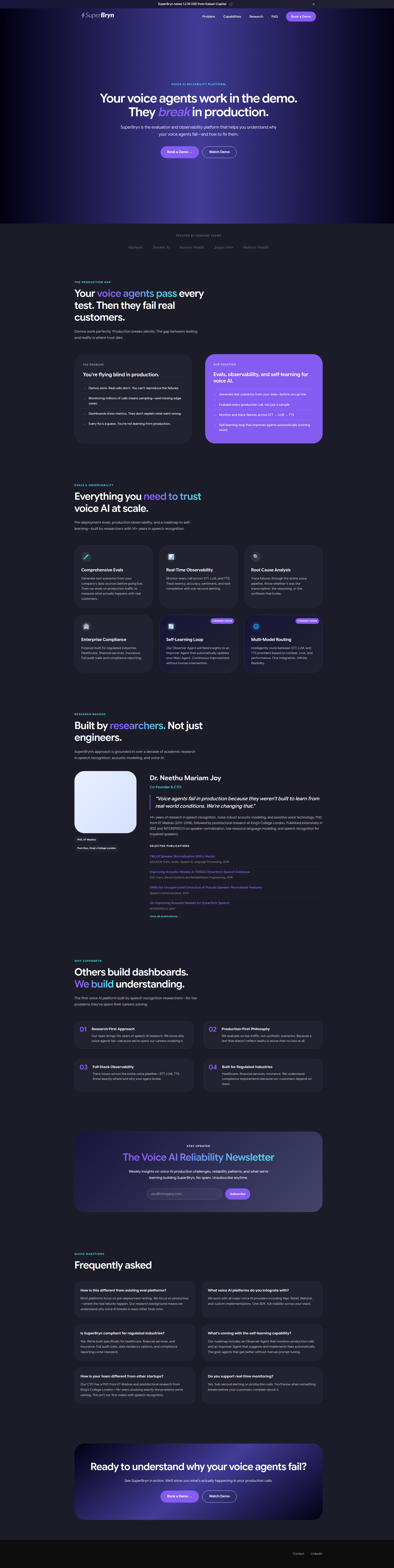Built by speech recognition researchers with over 14 years of academic and industry experience, SuperBryn takes a research-first approach to solving production reliability challenges that other platforms miss. The platform is purpose-built for regulated industries including healthcare, financial services, and insurance, with full audit trails, compliance reporting, and data residency options included standard.