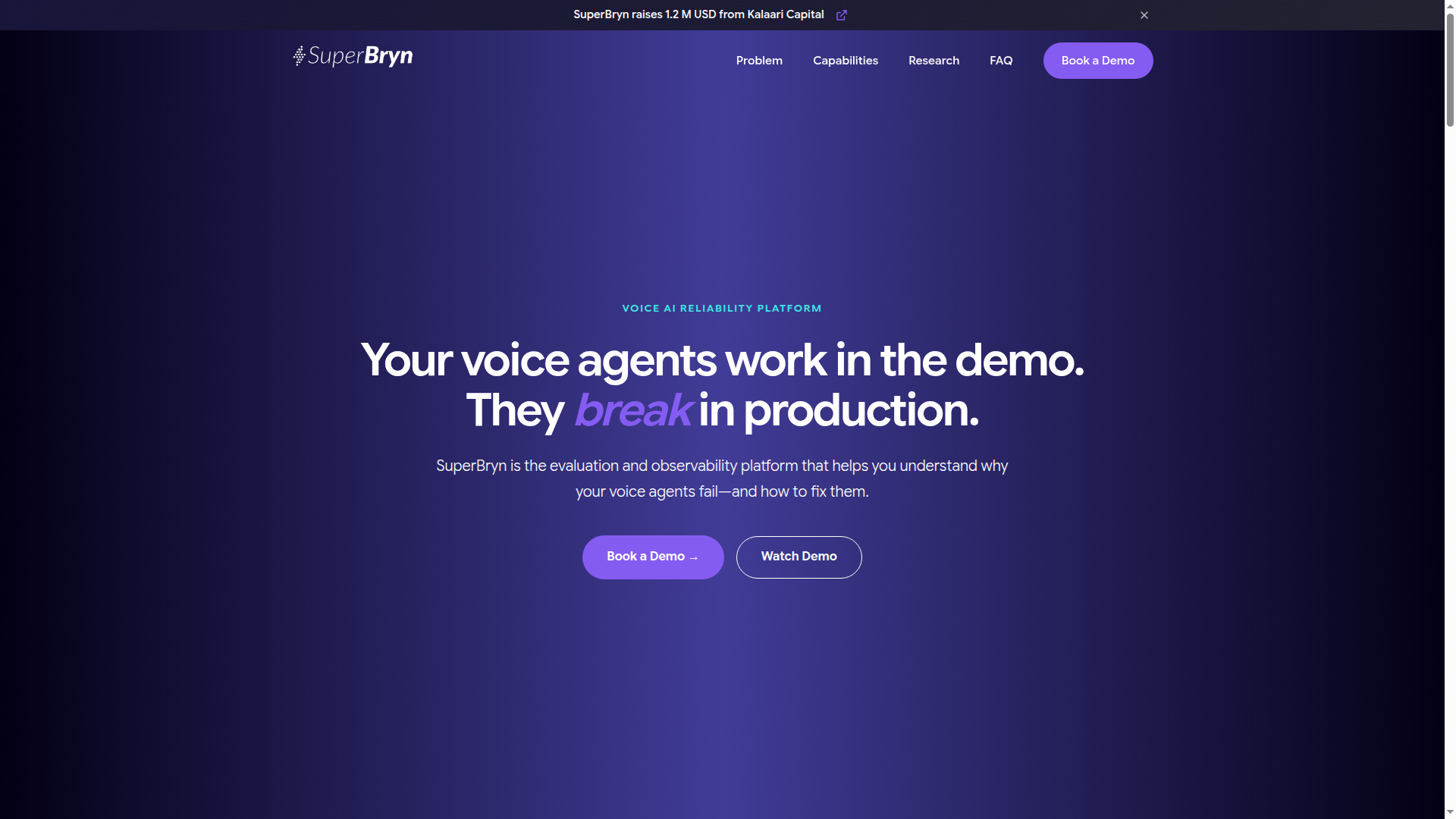 SuperBryn is a Voice AI Reliability Platform that addresses the critical gap between voice agent performance in testing and real-world production environments. The company provides comprehensive evaluation, observability, and self-learning capabilities specifically designed for voice AI systems. SuperBryn's platform enables teams to generate test scenarios from their data before deployment, evaluate every production call (not just samples), monitor and trace failures across the entire voice pipeline (STT, LLM, TTS), and automatically improve agents through a self-learning loop.