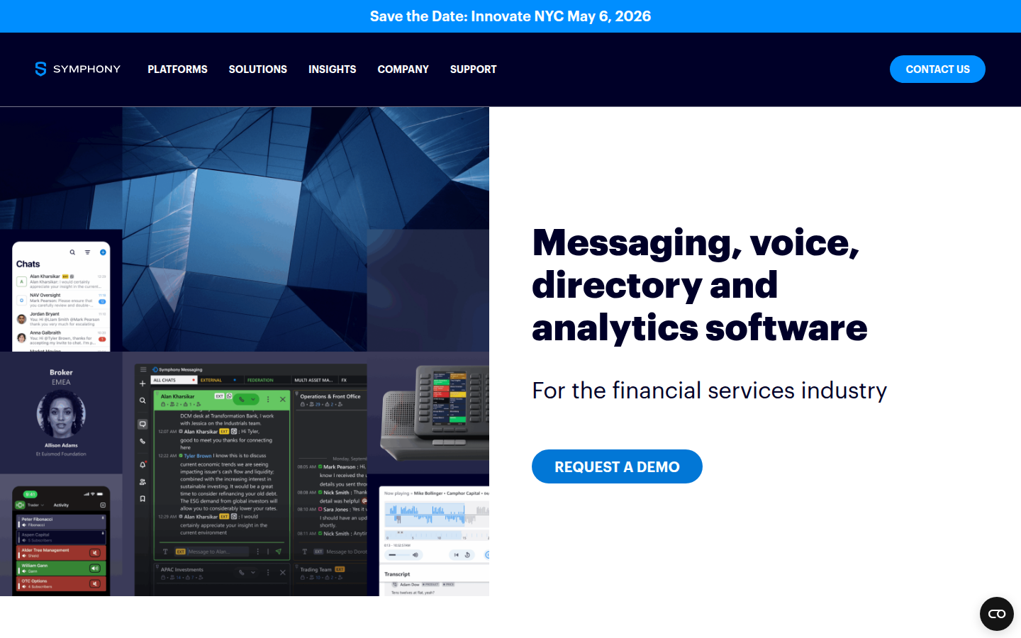Symphony is a communication and markets technology company founded in 2014 by a consortium of Wall Street firms. The company provides four interconnected platforms specifically designed for the financial services industry: Symphony Messaging for secure enterprise messaging, Cloud9 for cloud-native trader voice communication, Symphony Directory for connecting financial market professionals, and Symphony Analytics for AI-powered market intelligence.