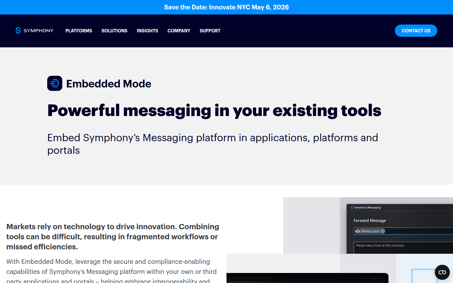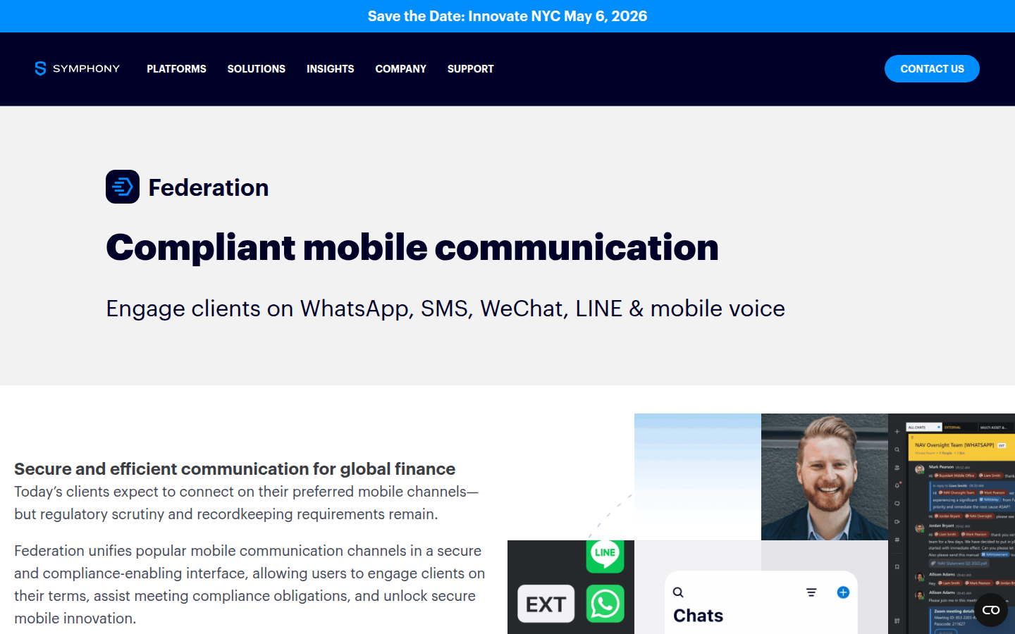 Symphony's solutions enable secure external workplace messaging, omnichannel communication including WhatsApp and SMS integration, and robust compliance capabilities. The platform serves major investment banks, asset managers, and financial institutions globally, with over 100 integrations and 1,500 bots to streamline workflows. The company focuses on delivering uncompromising security and regulatory compliance while enabling modern collaboration tools for finance professionals.