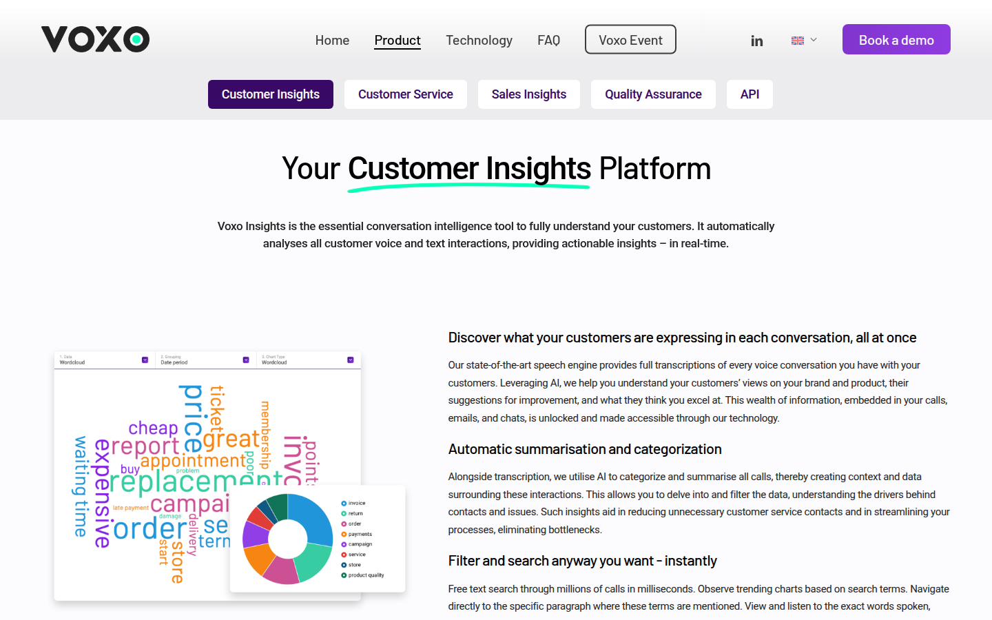 Voxo's platform offers automatic conversation summarization, satisfaction scoring based on sentiment analysis, and generative AI-powered customer feedback identification. The solution serves multiple business functions including customer service, sales, quality assurance, and marketing teams. Through their API, businesses can upload audio files for detailed analysis or access comprehensive historical conversation data to drive data-driven decision making.